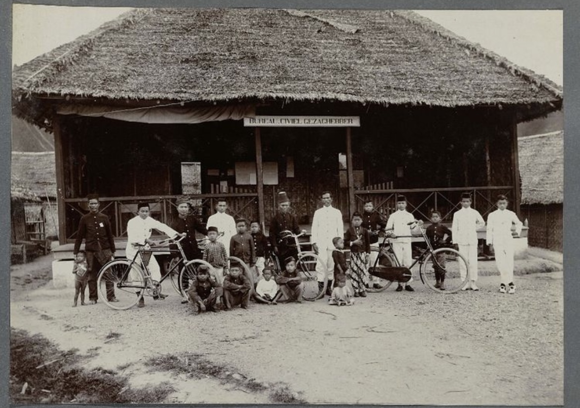 Een groep Indiërs, in uniform en sommigen met fietsen, poserend voor het Bureau Civiel Gezaghebber in Atjeh. Ingeplakte foto in een album met 87 foto's over de aanleg van de Gajoweg op Noord-Sumatra tussen Bireuen en Takinguen tussen 1903-1914.