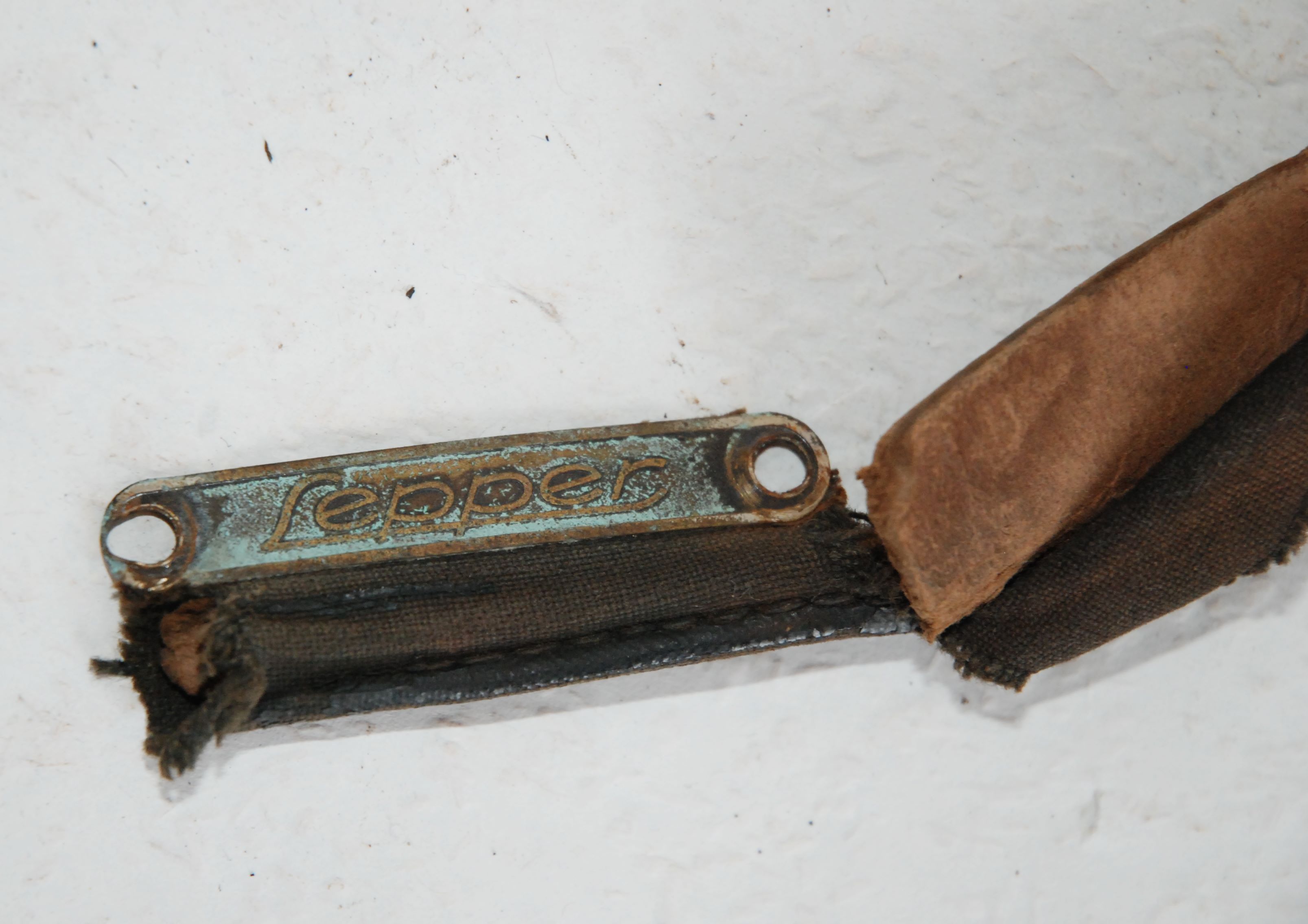 Op mijn Eysink fiets met hulpmotor 1934 zit een zadel zonder zadeldek. Er hing alleen nog een strook leer aan met het Lepper logo.