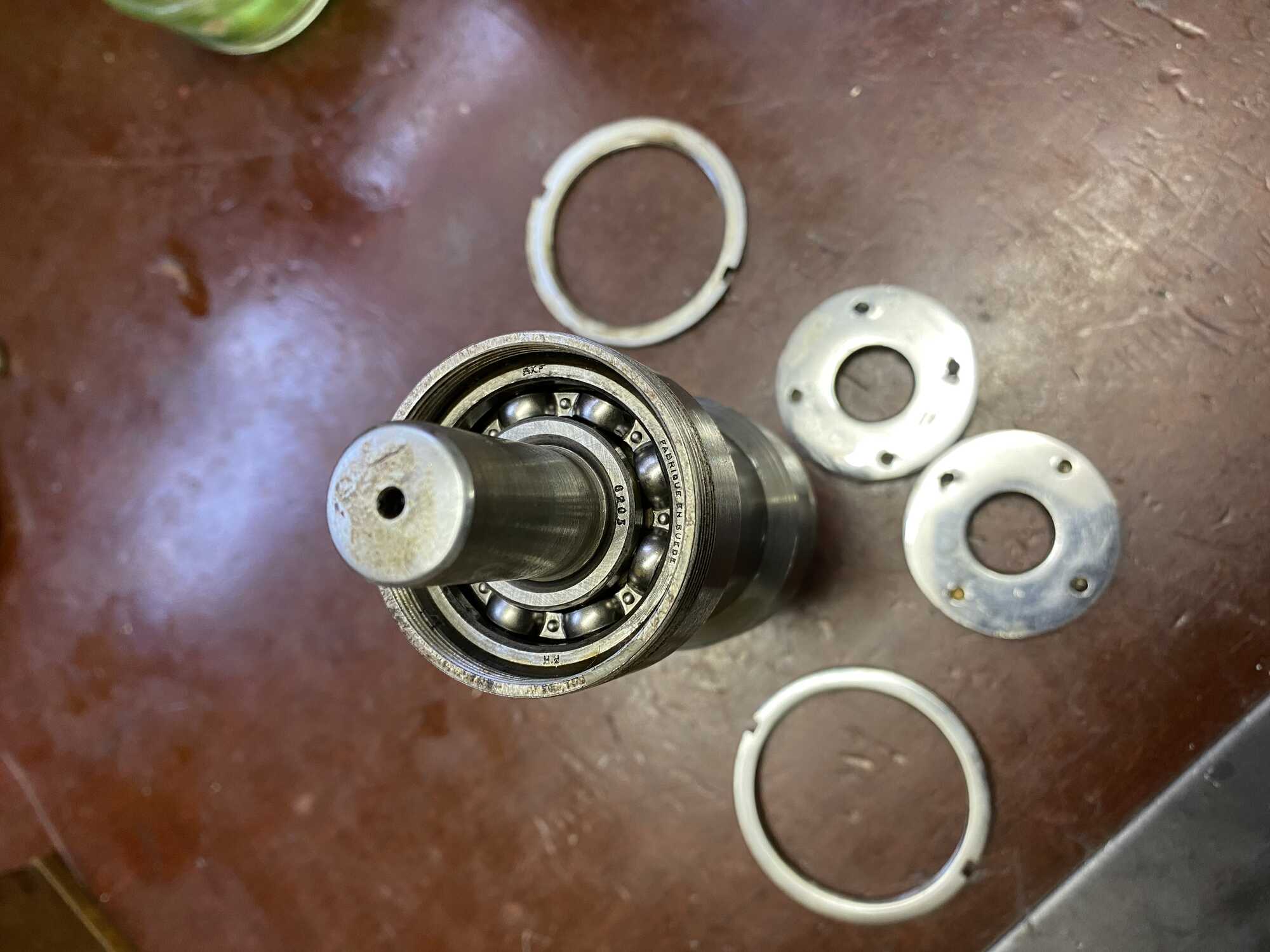 Je kan de stofkappen eraf schroeven en dan zie je de lagers zitten. Kan uit elkaar geperst worden maar ik zou het houden bij schoonspoelen in wasbenzine . Dan zal het met nieuw vet best wel weer netjes draaien.