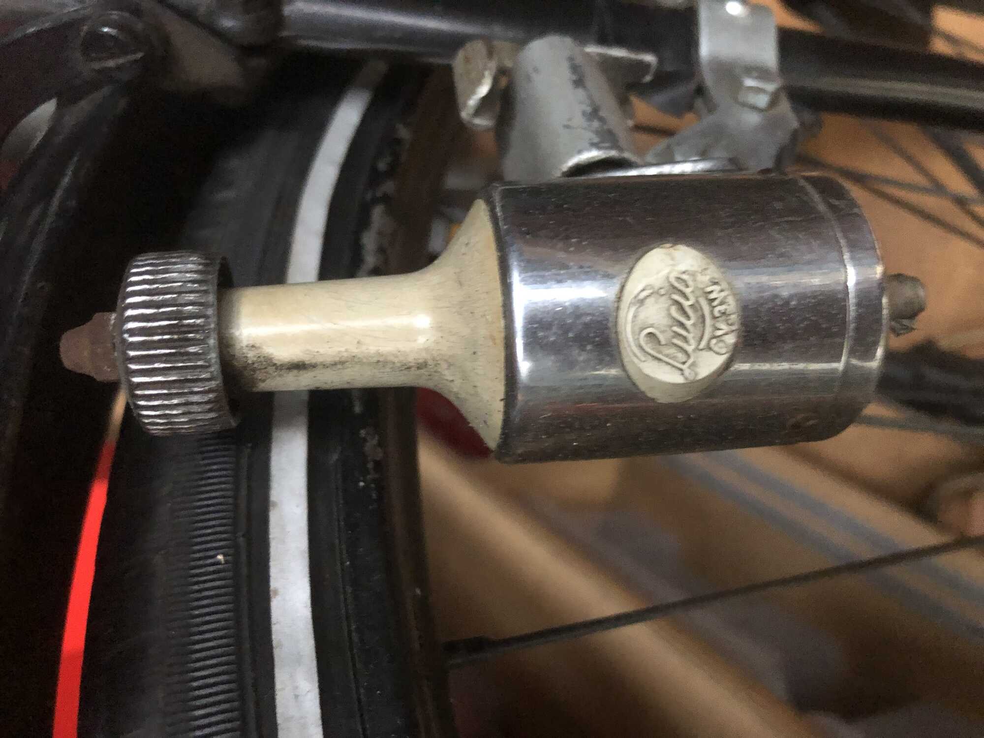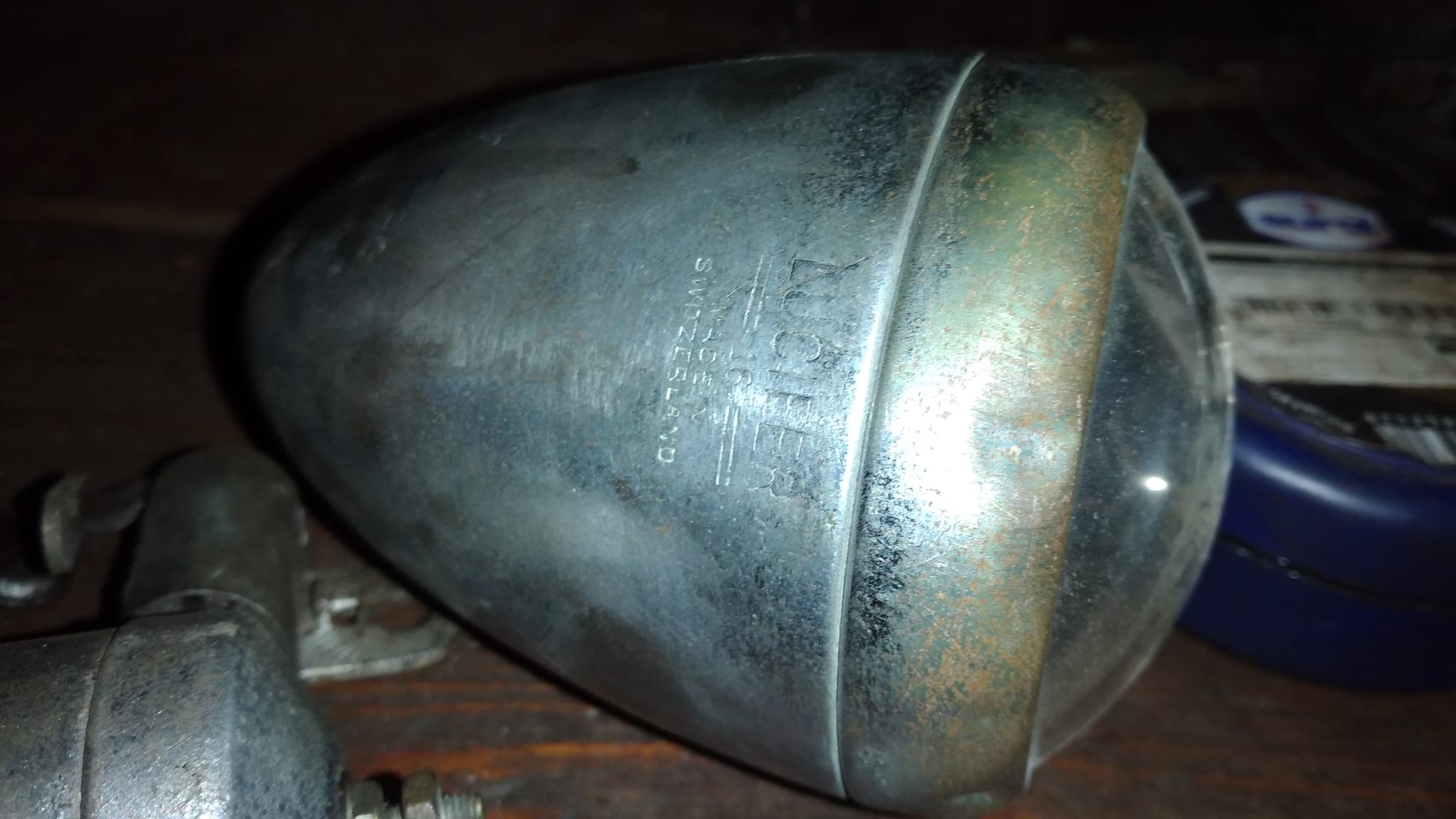 Leuk dat je bel en koplamp hebt liggen! Heb je daar ook een fotootje van? De koplamp is mijn insziens een brede chromen lamp met een Philips logo bovenop en een schakelaar om te kunnen wisselen van groot naar klein licht.