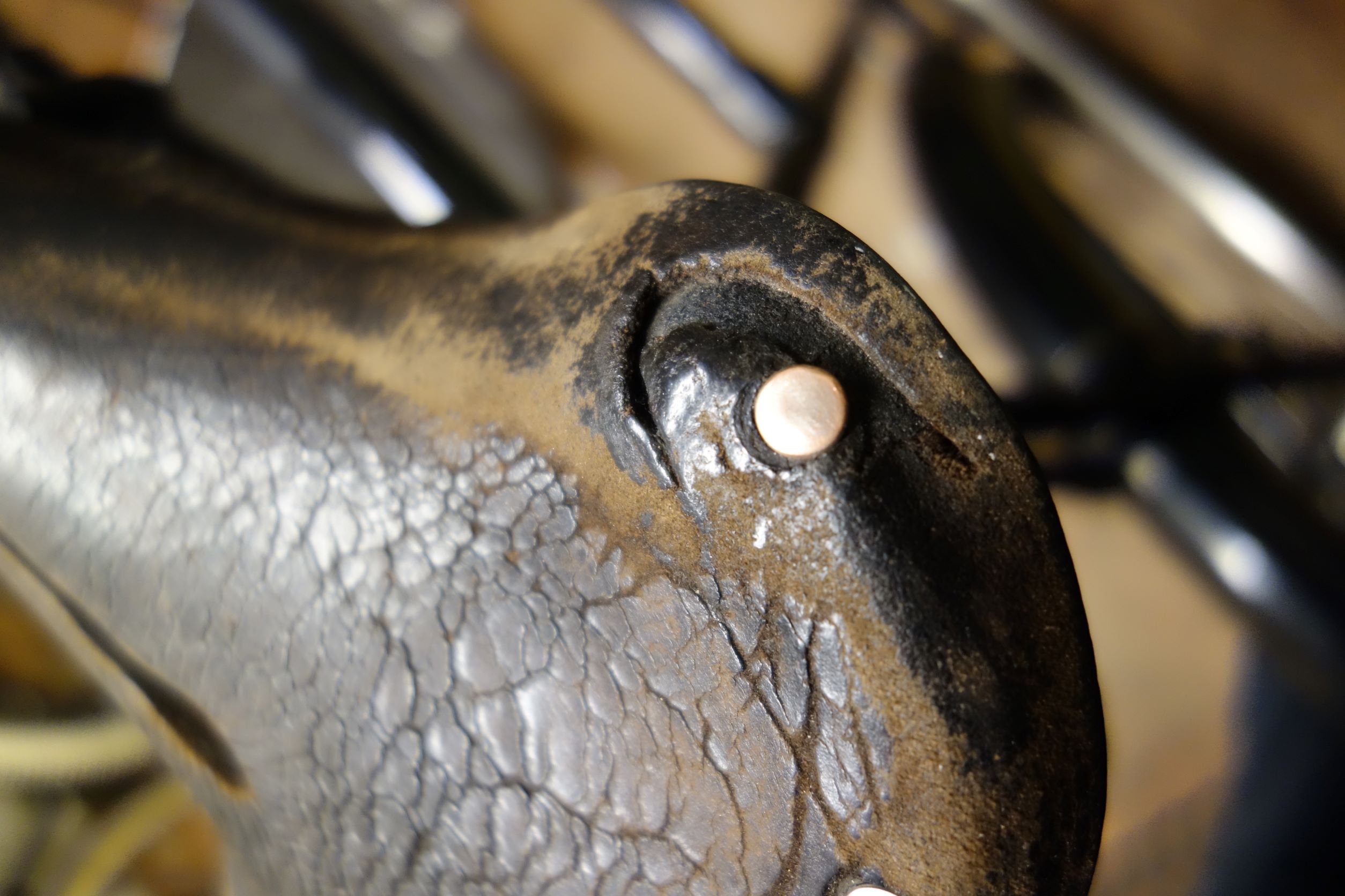 Het zadel is van een donorfiets voor - inderdaad - een Mervilex. Die komt bij Simon in Den Bosch vandaan. Wat bij het Vilex systeem hoort, is er nog (frame, de trapas omringd door 5 versnellingen, trommelrem en freewheel, de achternaaf met enorm tandwiel - 36t - en de primitieve shifter met veertje en kogeltje om een van de 5 versnellingen te activeren), maar verder ben ik grotendeels aangewezen op de donor (een Excell, ook uit 1949).