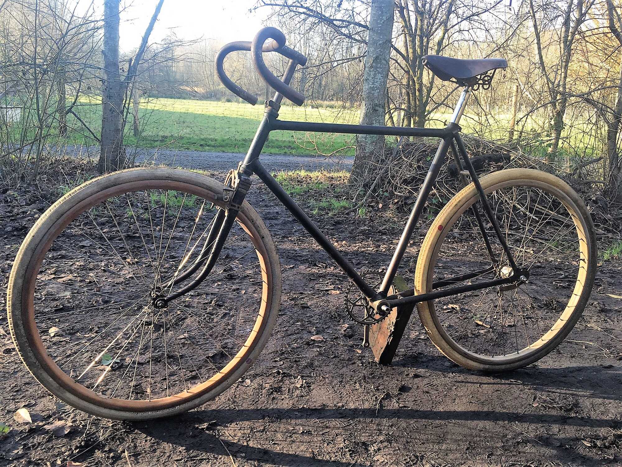 Rivolier 1928 (met een te jong zadel...). Het is een erg gelijkend frame, dus het zal wel geen doodzonde wezen wanneer ik er een sportfiets van maak, neem ik aan. Hoe dan ook ken ik het merk niet en mis ik alle oorspronkelijke onderdelen... Het enige wat ik weet is dat het een Frans frame is, vermoedelijk 1925 à 1930, zou ik denken
