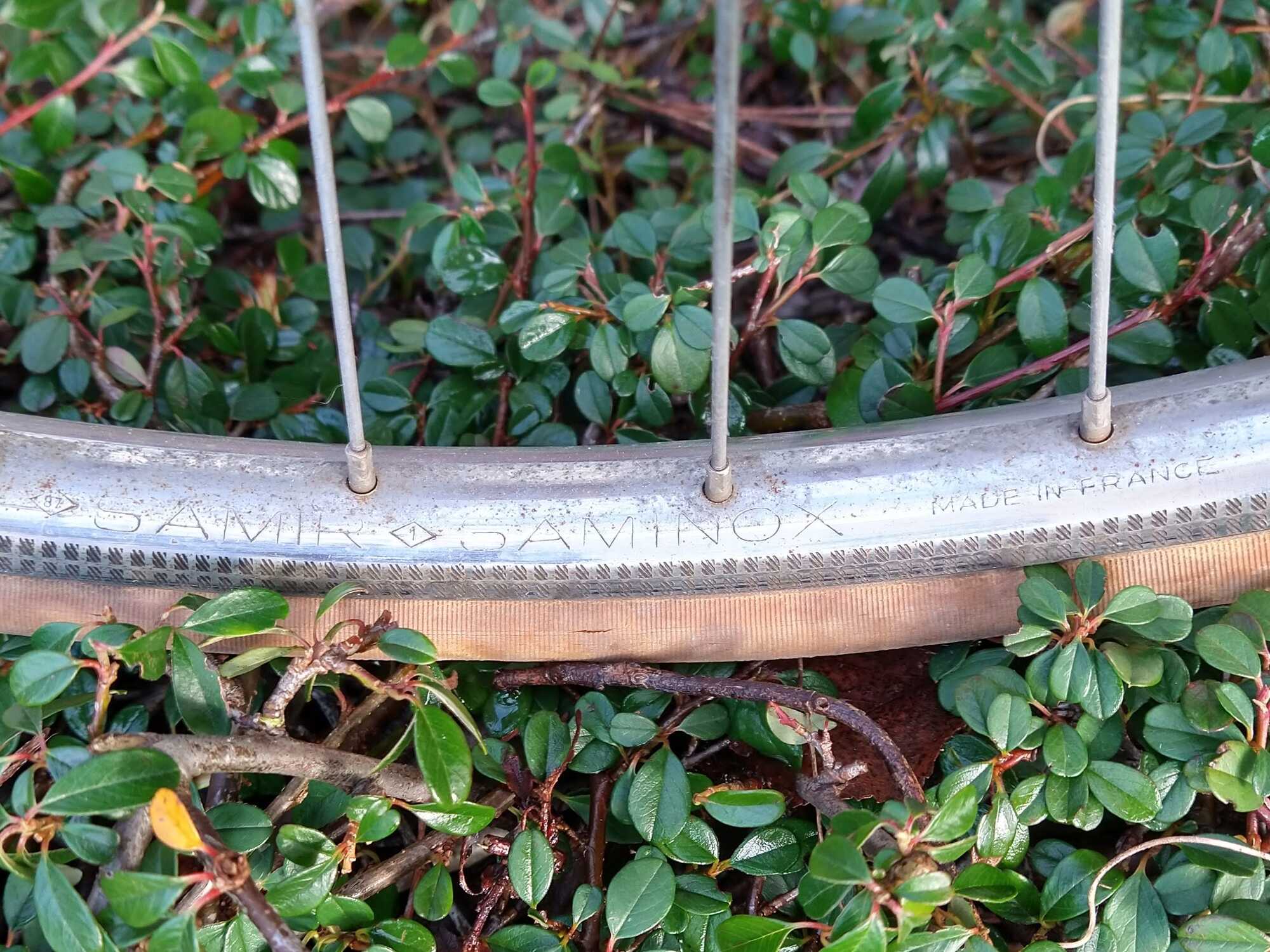 Dit is de netste set die ik erbij vond: Samir Saminox, 28" (700C). Ik heb even een klein stukje gepoetst, en zo te zien zijn ze nog prima weer netjes te krijgen.