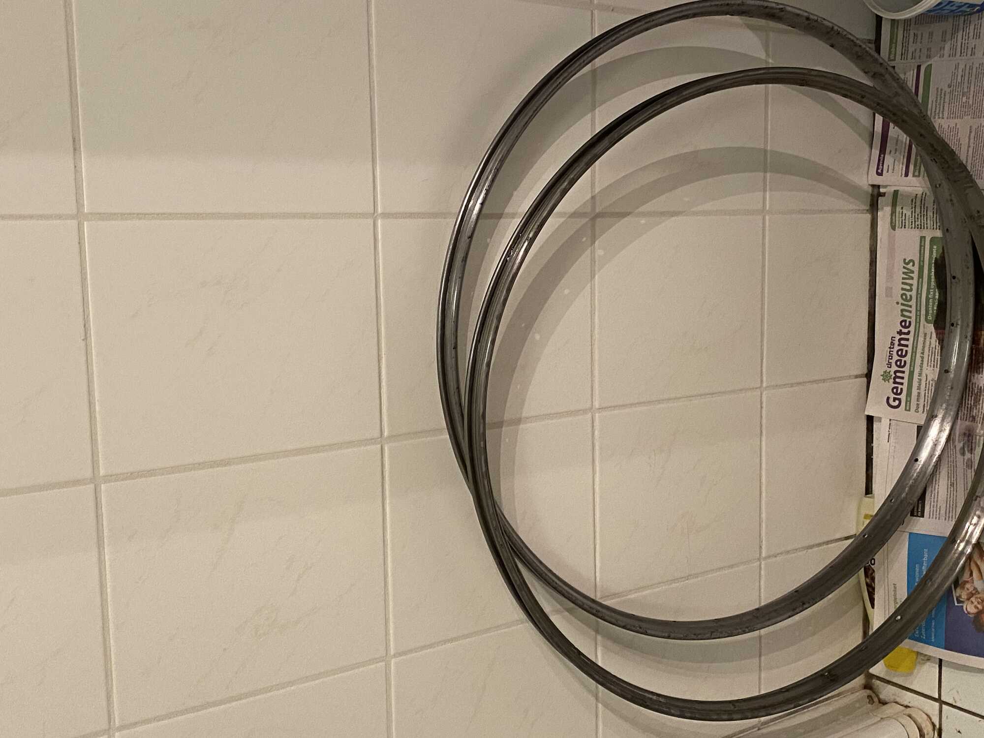 Uiteindelijk maar ervoor gekozen de wielen zo dicht mogelijk naar nieuw te restaureren met nieuwe spaken want ik wil dat er wel mee gefietst kan worden en de velg niet gelijk weer roest. Een velg heb ik nu helemaal kaal tot op het staal, das nog best een klus. Het frame/rijwieldeel laat ik wel zoveel mogelijk in de oude lak. De achtervork haal ik wel voor een klein geroest deel kaal en conserveer ik.