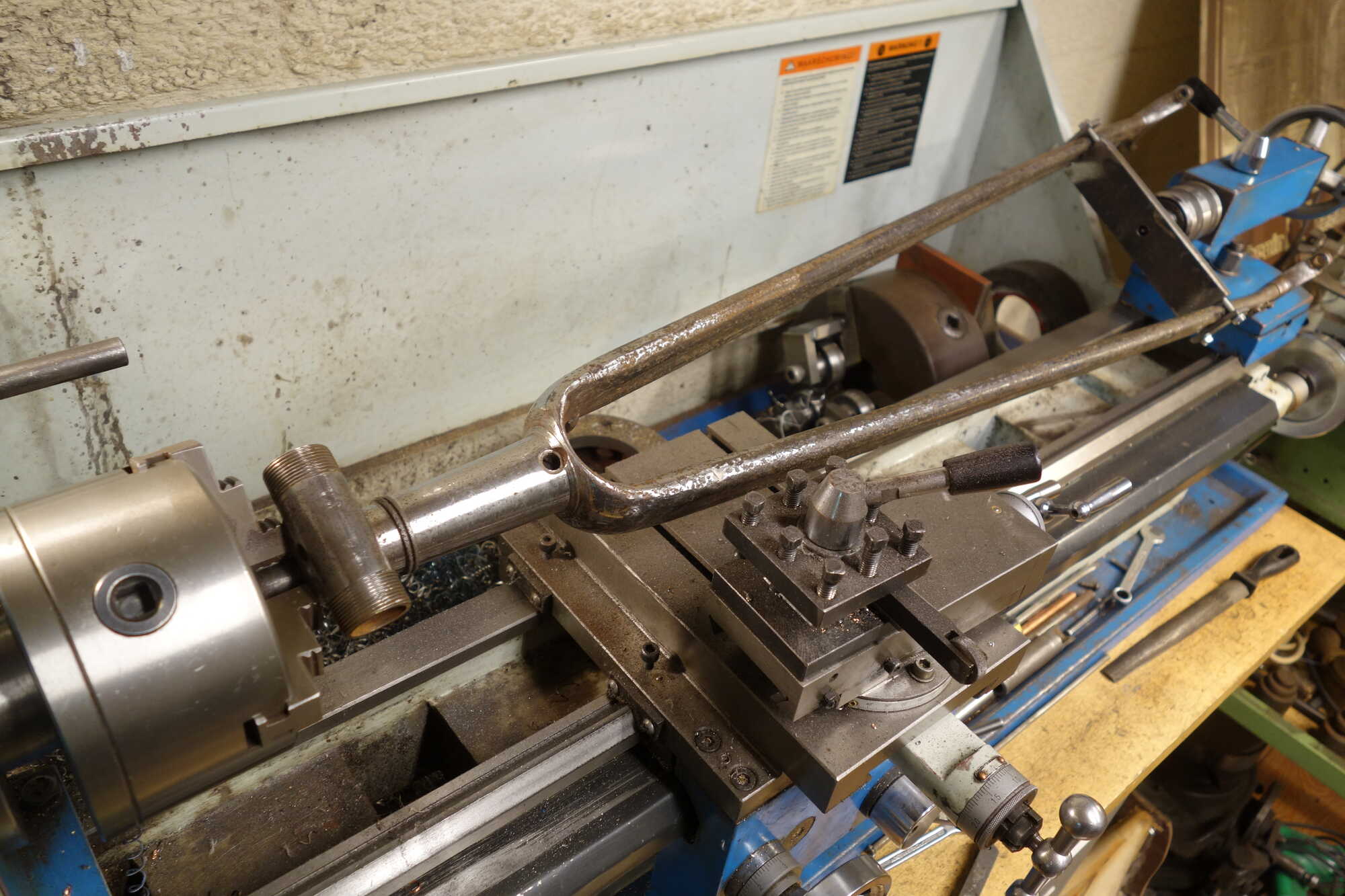 Omdat ik de head weer in nette staat wilde hebben heb ik het plan gemaakt om de gehele vork in de draaibank te plaatsen. Op die manier kon ik de head afdraaien en ook weer voorzien van sier karteltjes net boven de ophanging van de backbone.