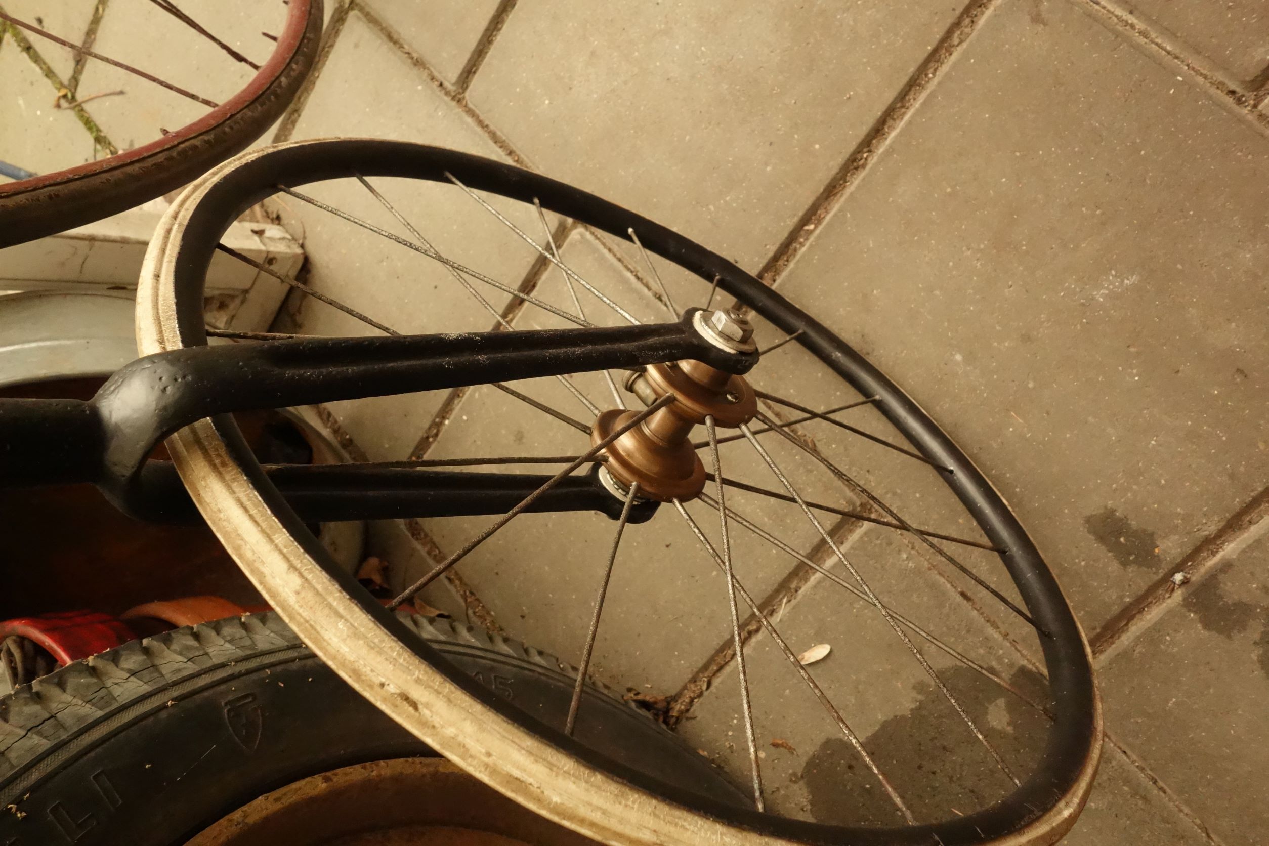 Bij hoge bi`s zijn achterwielen met glijlagers nog enige tijd de standaard geweest. Die kunnen overigens ook heel netjes en soepel lopen. Inmiddels begint de fiets weer ergens op te lijken en de overeenkomst met mijn 1882 Matchless is opvallend.