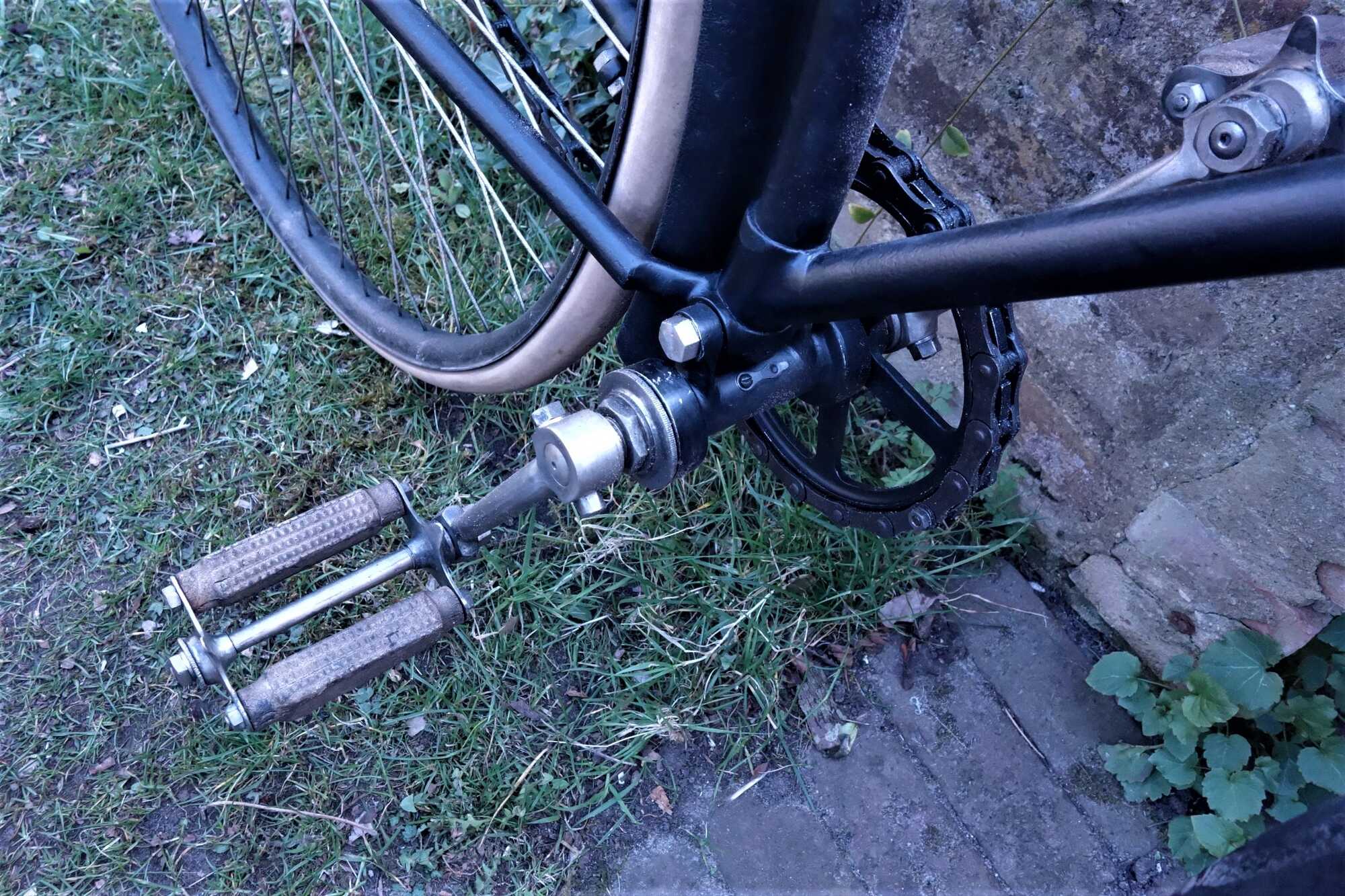 De originele voetrust-rubbers zijn identiek evenals de opstap die gecombineerd is met de spatbordstang (dat verzin je maar een keer). Bovendien zijn de spatbordophangbeugels tamelijk overeenkostig met mijn fiets. Een overeenkomst noem ik een toevalligheid maar drie overeenkomsten is ''binnen'' wat mij betreft.