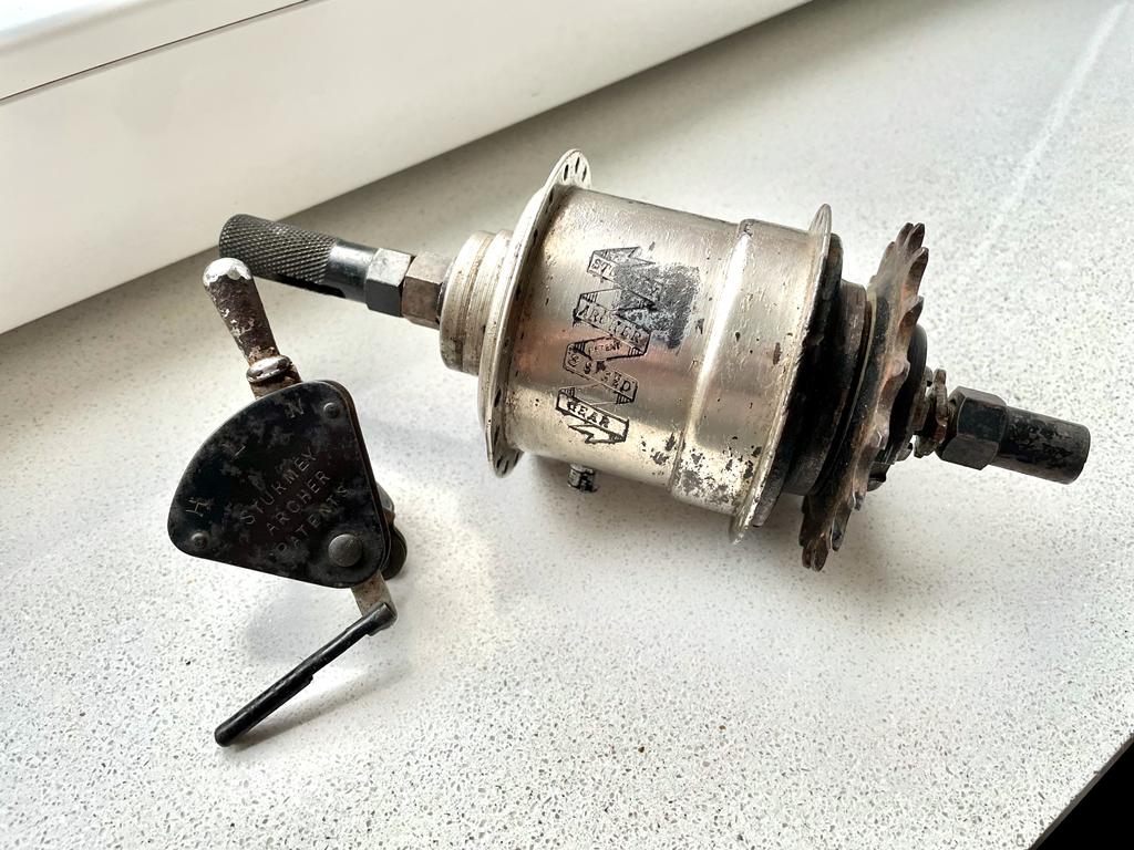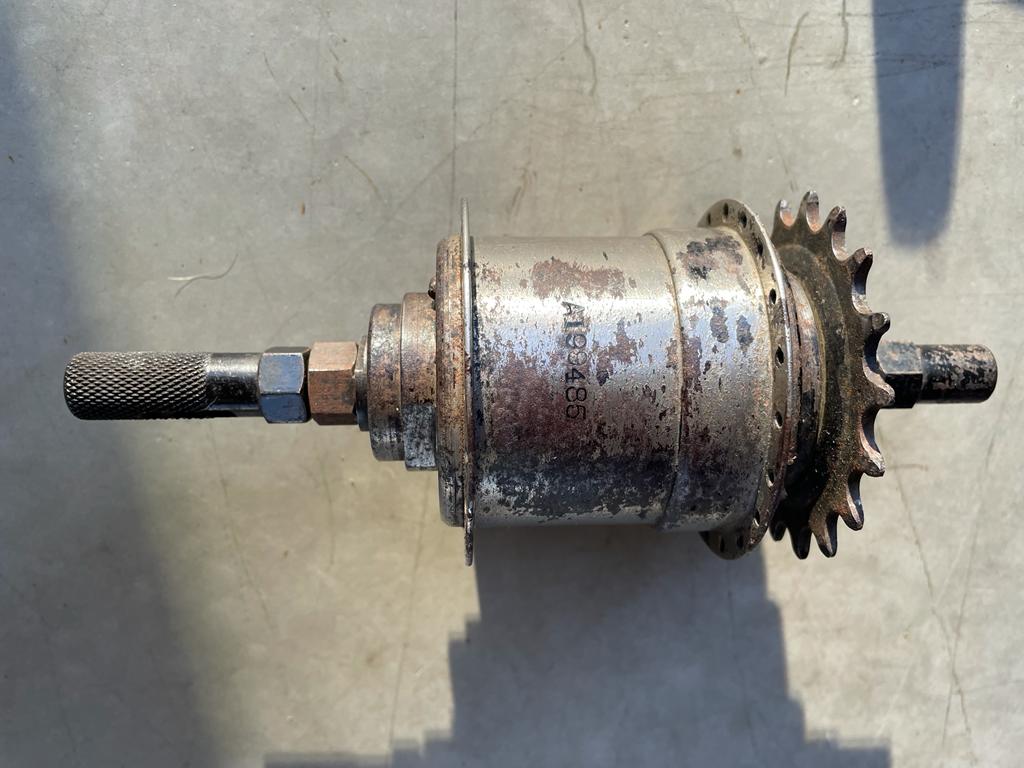 Het is een schitterende vondst deze fiets ten eerste. Ook een hele mooie SA naaf. Heb je de versteller er ook bij?