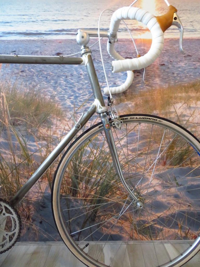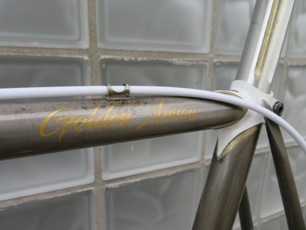Via via kreeg ik een Concorde frame in handen. De lak was in een vreselijke staat, maar de originele onderdelengroep toonde amper slijtage. Puur voor de lol om naar eigen smaak iets aparts te maken heb ik alles uit elkaar gehaald, frame kaal gemaakt, wat in de weer geweest met blanke lak en witte en gouden Hammerite en vervolgens de onderdelengroep (Shimano Golden Arrow) weer teruggeplaatst. De remgrepen (de wat zeldzamere BL-H105, met de 'dichte gaatjes' in de greep) heb ik NOS van Ebay inclusief rubbers, de rest van de Golden Arrow groep was al aanwezig.. tot de bottom bracket aan toe.