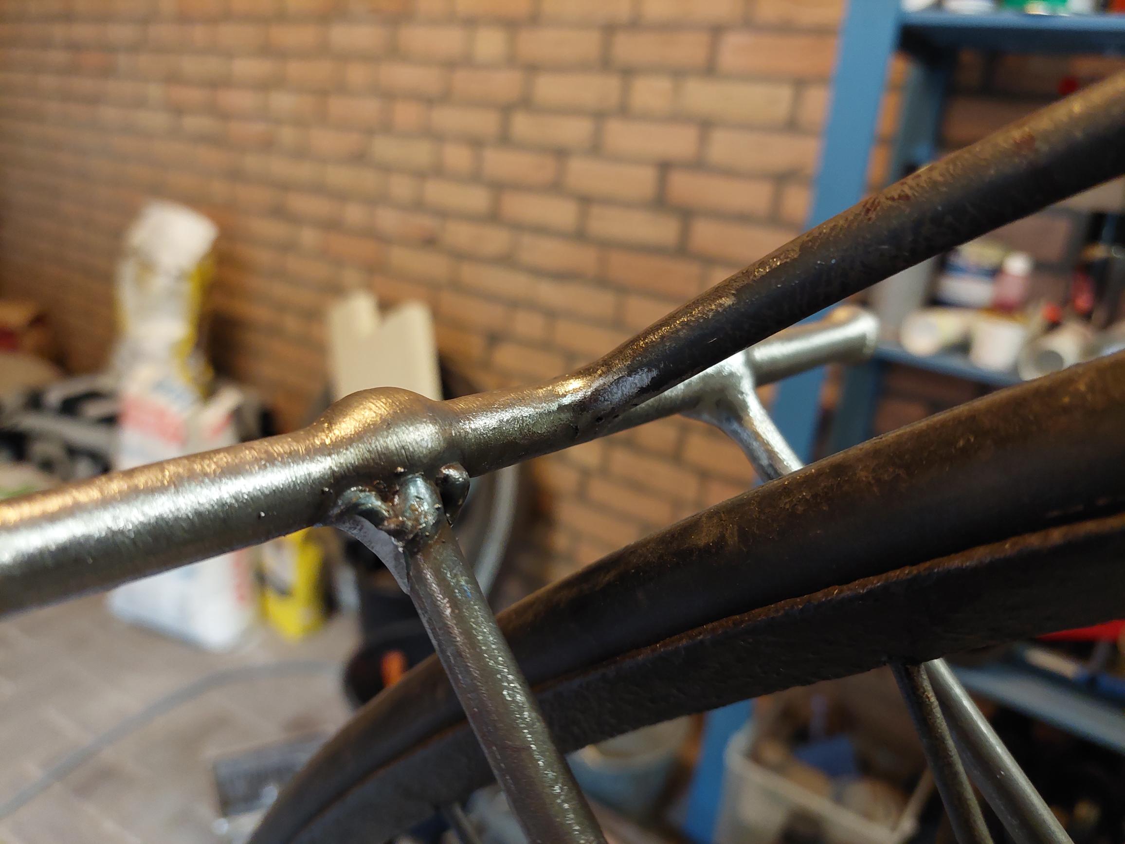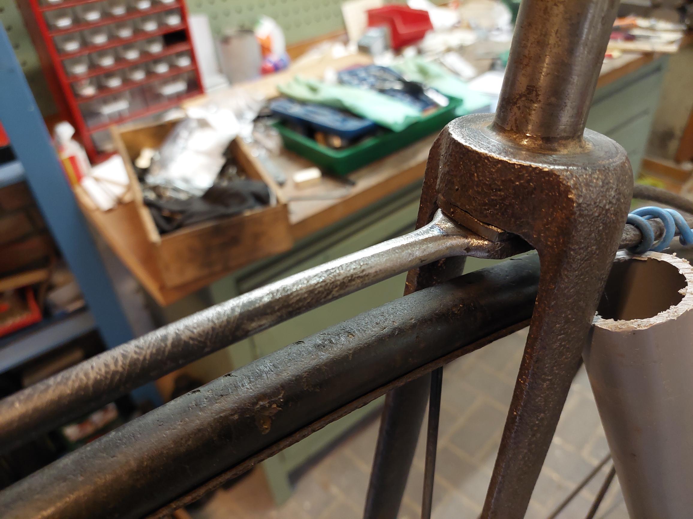 Bij deze fiets heeft iemand ooit de afgebroken steun nagemaakt, maar zonder te weten hoe dat ding er echt uitzag.