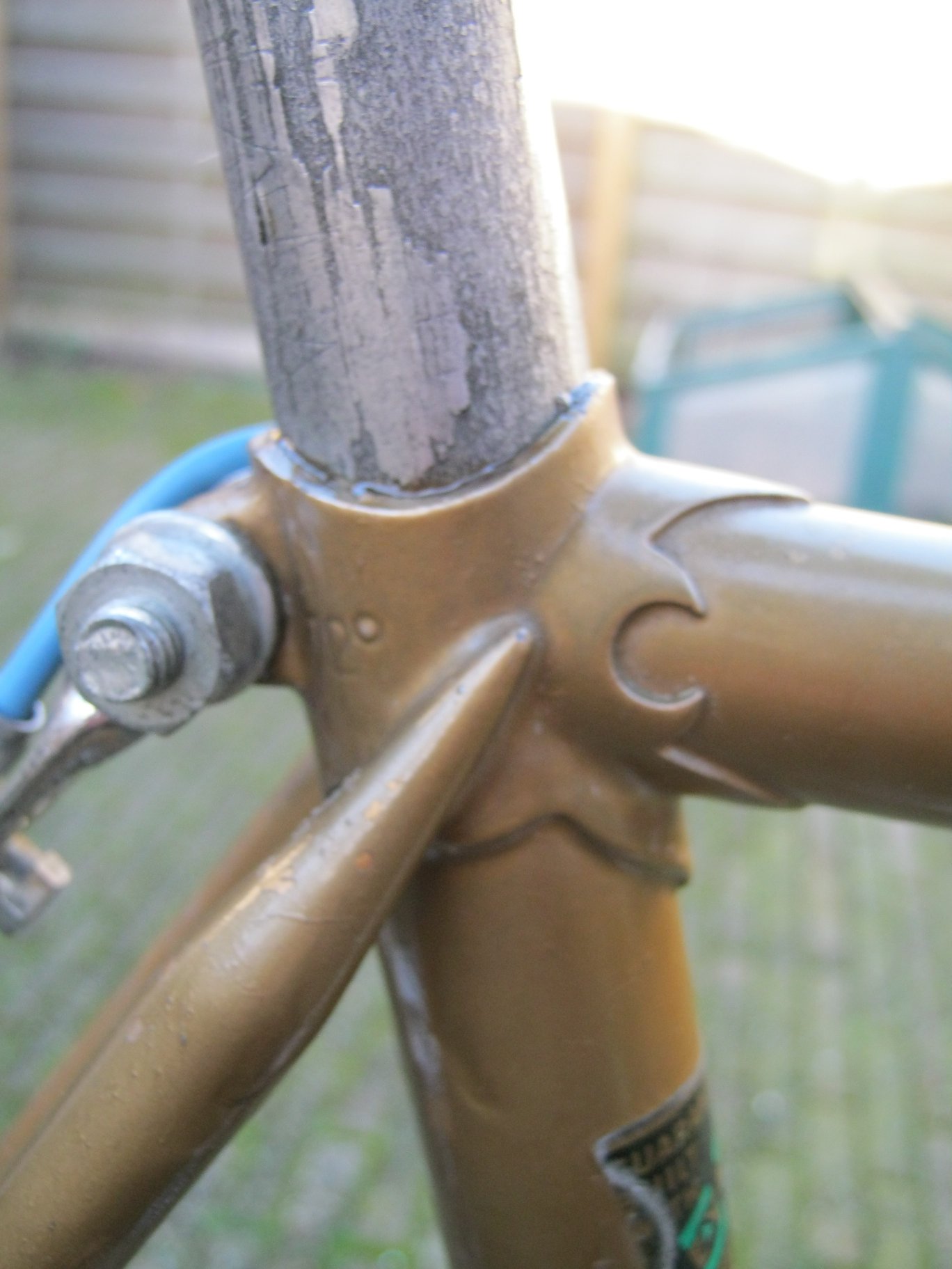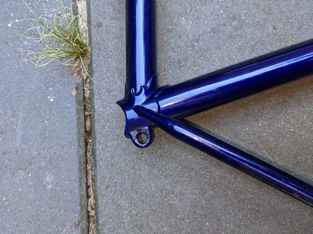 Er zijn/lijken die pleiten voor een Locomotief uit de Amsterdamse periode van framebouwer Bertus Slesker, 60's. Zoals de verschillende typen Nervex lugs. De luxere Professional lugs aan de achterkant (zadel en bracket) en de eenvoudigere aan het balhoofd boven en onder. Ik heb begrepen dat Slesker een hekel had aan de opstaande rand die de balhoofdlugs van de Professional hadden. Slesker (en met hem veel framebouwers uit die tijd) slepen dat er af. De aangesoldeerde stukken zijn inderdaad van veel later. Alhoewel Locomotief als een van de eersten de derailleurverstellers al op de onderbuis soldeerde. Wel werd de hele nok erop gesoldeerd zowat. Derailleurkabels onder de bracket is van zeker meer dan een decennium later. De potloodeinden van de staande achtervorkbuizen zijn bij die van mij toch wat spitser. De Ekla-D voorvorkkroon werd weliswaar door meerdere bouwers gebruikt (o.a. RIH). Of de verstevigingsribben aan de binnenkant typisch Locomotief zijn, durf ik niet te zeggen, die van mij heeft ze wel/ook.. De lange Campagnolo patten zijn ook niet echt uniek.