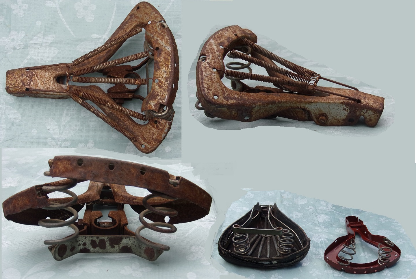 Hierbij plaatjes van het aangetroffen zadel en een reconstructieprentje van onder- en boven-frame met spiraalveren-stel.