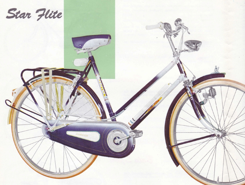 Paar maanden geleden heb ik ook een Star Flite op de kop kunnen tikken; datering rond 1963. Ik dacht eerst serieus dat iemand met een spuitbus op het frame tekeer was gegaan vanwege het vloekende geel op groen op wit, tot ik de folders in de documentatiebank zag. Zo lelijk dat ie vet mooi is..