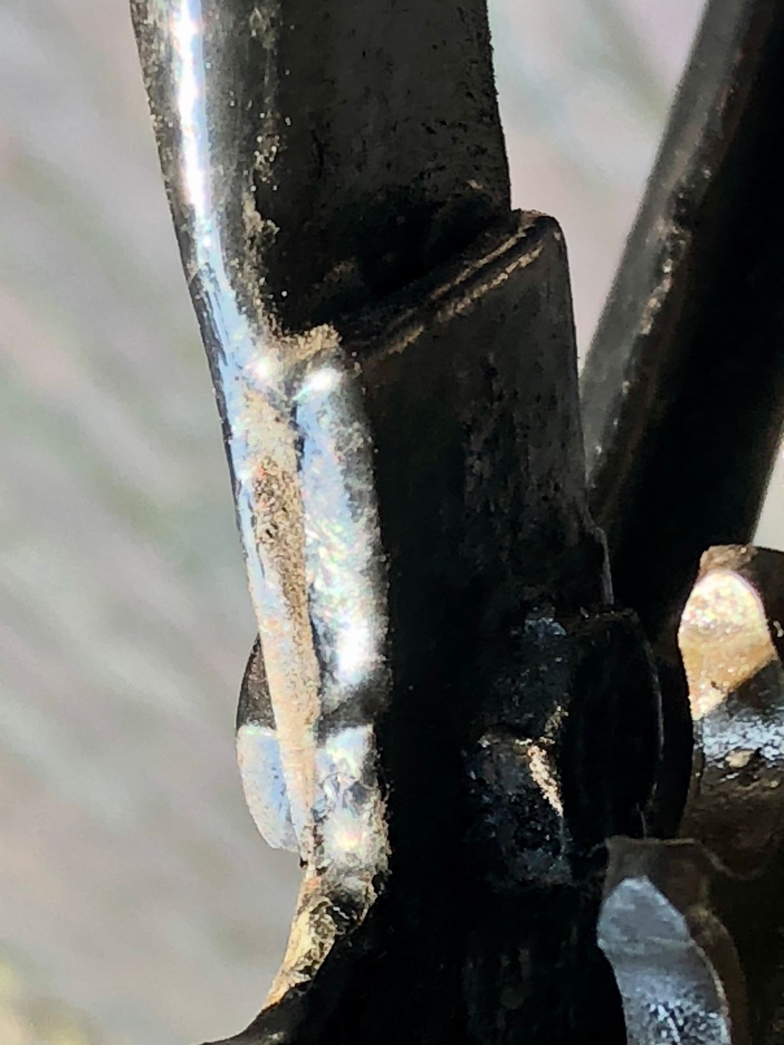 Ook interessant is de achtervork constructie. Een ingesoldeerde achterpad zoals typisch voor jaren '20 (transport)fietsen, maar dan met normaal model staande achtervork met bouten verbonden. Of de maker was het laaste restje van deze achterpadden aan het opmaken, en had geen staande achtervork buizen meer hiervoor, of de staande achtervork is ooit vervangen (waarschijnlijker).