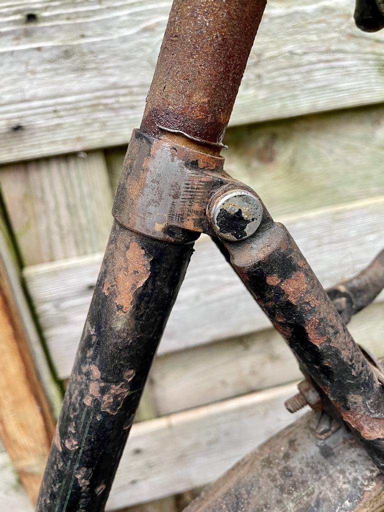 Mijn theorie is dat de fiets bij de, inderdaad overduidelijke revisie, van een herenmodel (maat 60) is omgebouwd naar een damesmodel (maat 55) en dat de lug waar het originele framenummer was ingeslagen is vervangen door eentje zonder framenummer. Het zou ook het ‘pinnetje’ verklaren dat zichtbaar is in de lug als extra versteviging. Van wegschuren of afvijlen zie ik niet echt sporen.