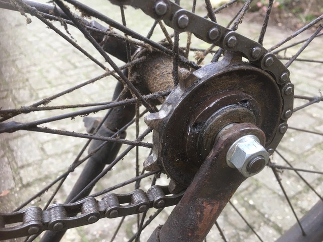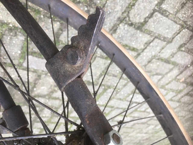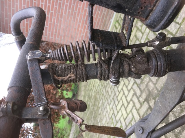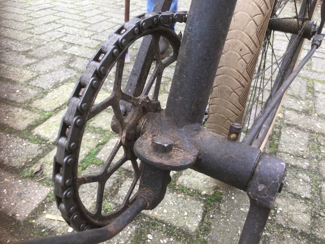 Vanmorgen was ik met Theo bij deze fiets en ja de hoofd verbindingen zijn gelast. Als je even de moeite neemt over het lassen met acytylern dan is de start rond 1834 en rond 1870 waren er goede verbindingen te lassen. Ik neem aan dat een creatieve smid deze fiets heeft samen gesteld. Dat het een comfortabele fiets is om mee te toeren sluit ik uit. Dat is in mijn ogen die reden dat er maar 1 is gebouwd. Er staat onderaan de balhoofdbuis 98 7 en ga er van uit dat de het bouwjaar en maand is. Het achterwiel: de is voor een Rondsnoer rubber en Martin heet een maat band die er net op blijft zitten. De as met achtertandwiel zijn ook passen in 1898. Ketting is nieuw en het voorblad is vervangen door een 3mm voor tandwiel. De voorvork is vervangen maar door een amateur even als het stuur. Voorwiel is ook vervangen.