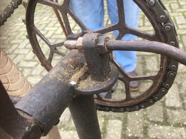Inch-tandwielen werden na 1900 hooguit nog maar voor racefietsen gebruikt, maar lassen was in die tijd echter ongebruikelijk (op een paar uitzonderingen na bij serieproductie). Hier zijn de amateuristische las-sporen op de trapas en zadelbuis duidelijk zichtbaar.