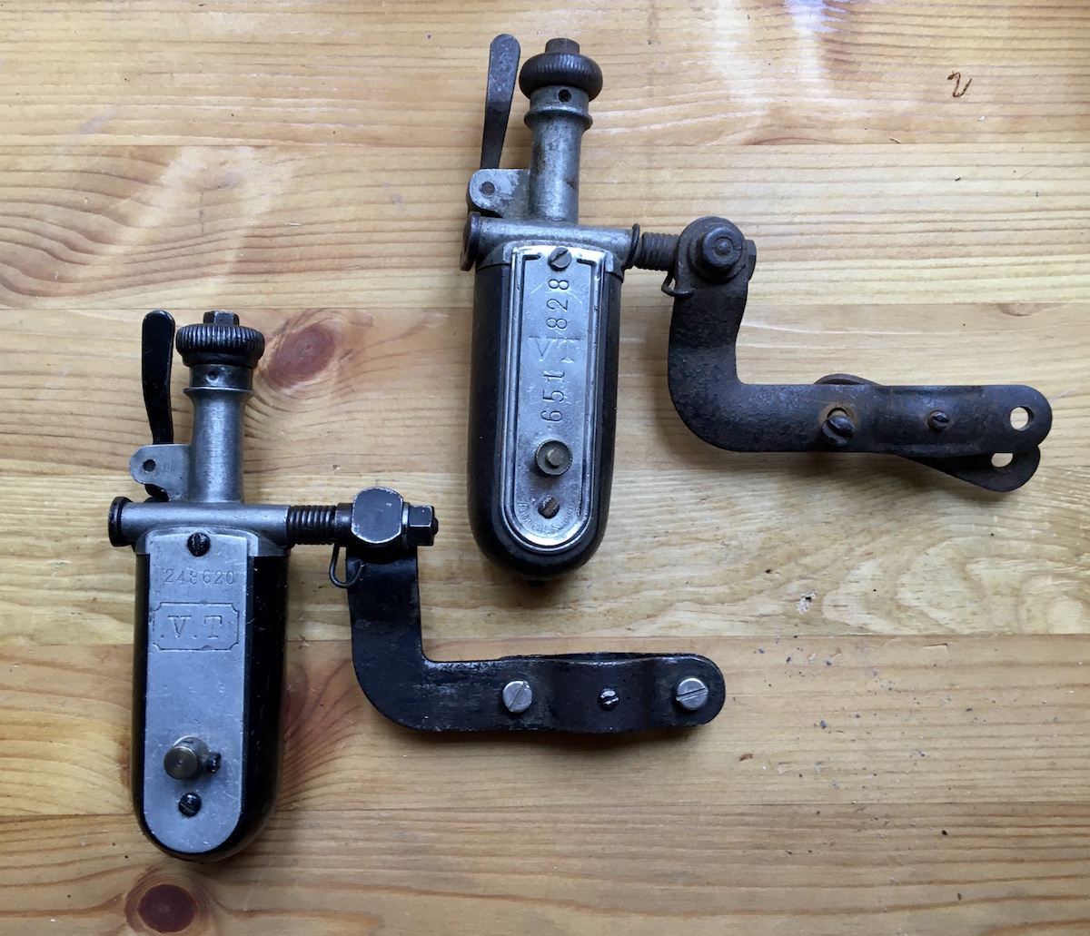 Importeurs of dealers mochten ze dus blijkbaar voorzien van hun eigen merken - wat bovendien vrij eenvoudig was aangezien alleen de (losse) afdekplaten gestempeld moesten worden. Geprofileerde platen (zoals die rechts op mijn foto) heb ik tot nu toe eigenlijk alleen van V.T. gezien, maar dat betekent niet dat er geen anderen waren.