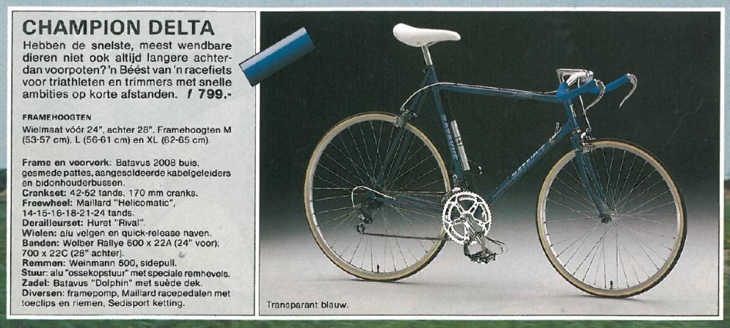 Ik heb een zo goed als originele Batavus Champion Delta op de kop kunnen tikken. Een vreemde fiets; zware buizen, vol goedkope onderdelen, en qua prijs dan ook bereikbaar voor de gemiddelde amateur (zie advertentie onder).