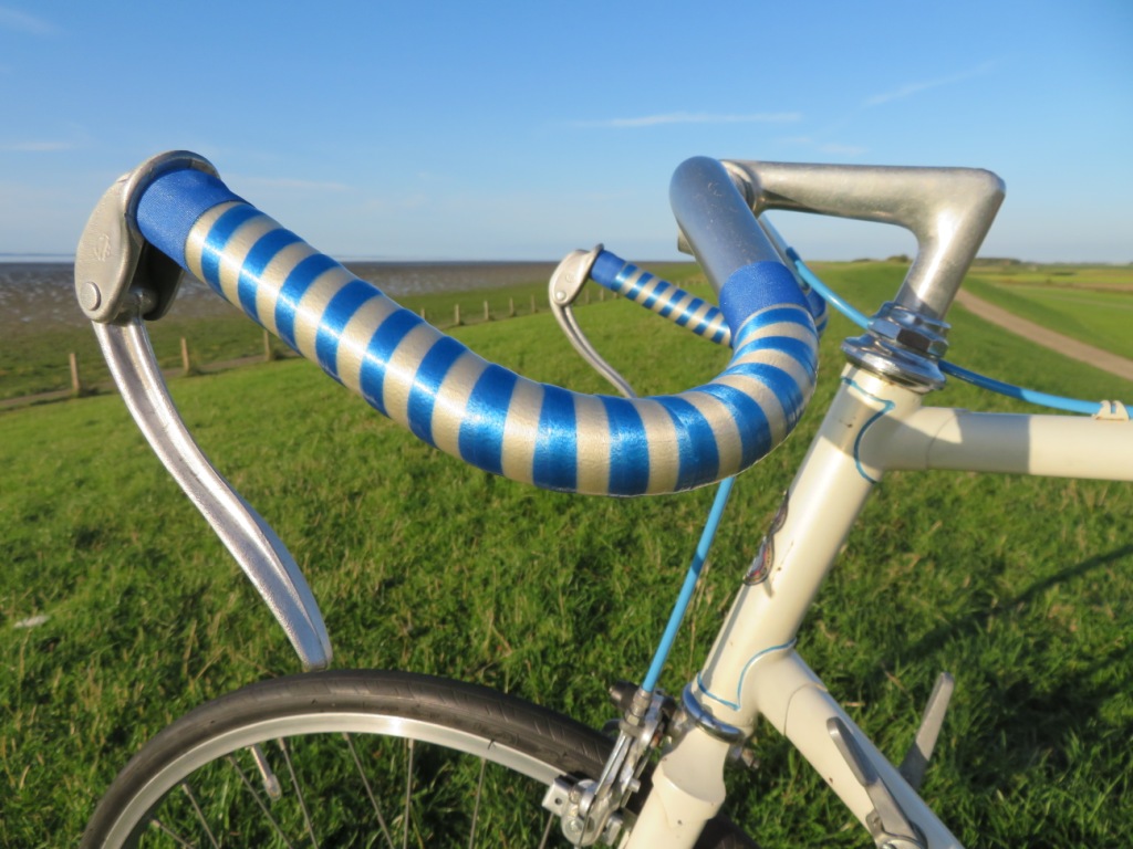Wat de tijdritfiets betreft, ik zoek nog naar een goed alternatief maar heb het rolstoelwiel voorlopig maar even laten zitten. Om dit topic mooi af te ronden een paar foto's van het (voorlopige) eindresultaat, met o.a. een nieuw-uit-oude-voorraad suède zadel precies zoals er ook op heeft gezeten (ik kreeg bij de koop van deze fiets het halfvergane originele exemplaar er bij)