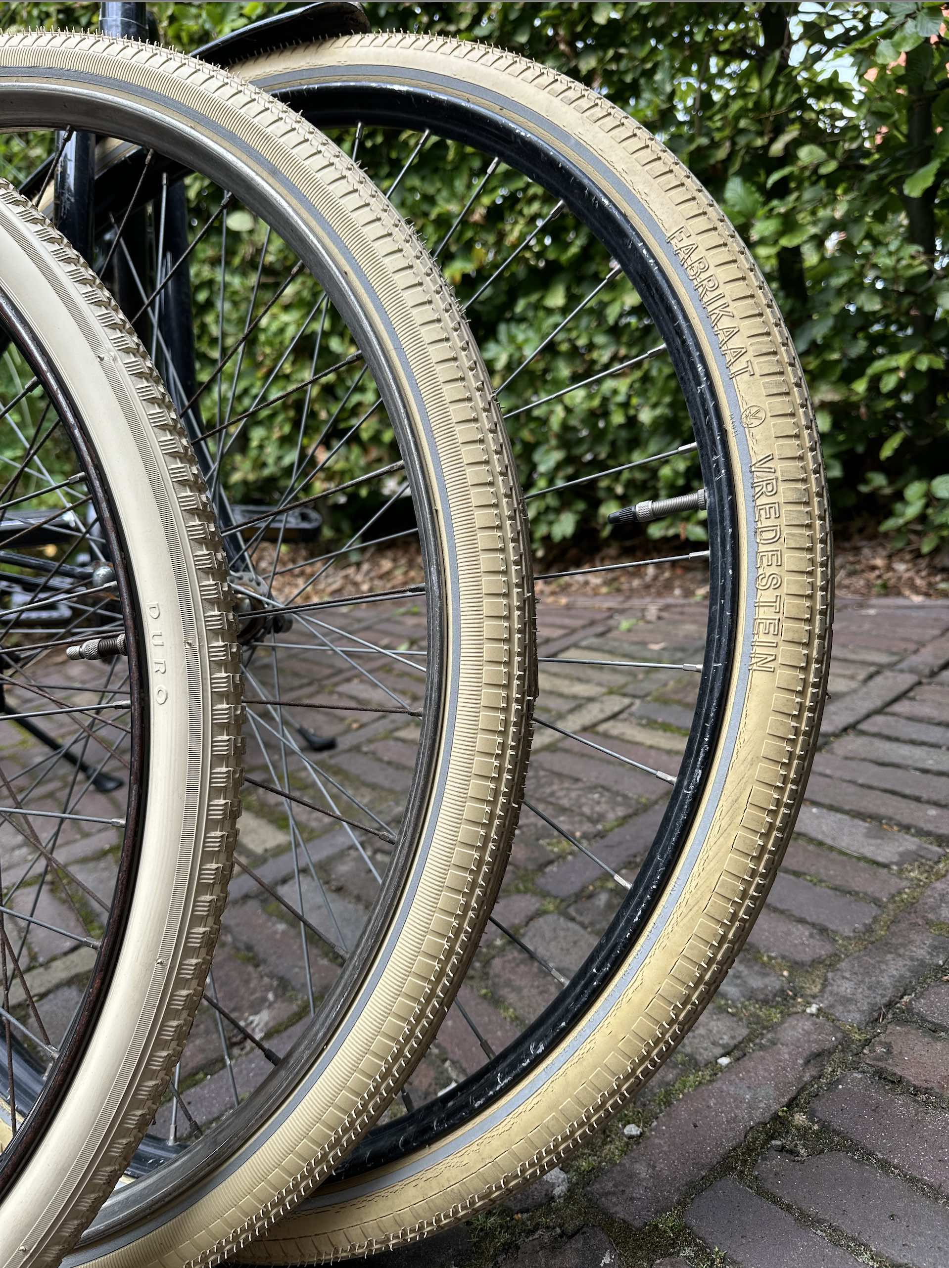 Deze banden heb ik gekocht zijn bijna dezelfde kwa profiel als die crème banden. Die witte rand haal je er zo af met wd40. Banden zijn niet duur ik heb er er vorig jaar een rit van 120km mee gemaakt op een oude fiets geen problemen mee gehad.