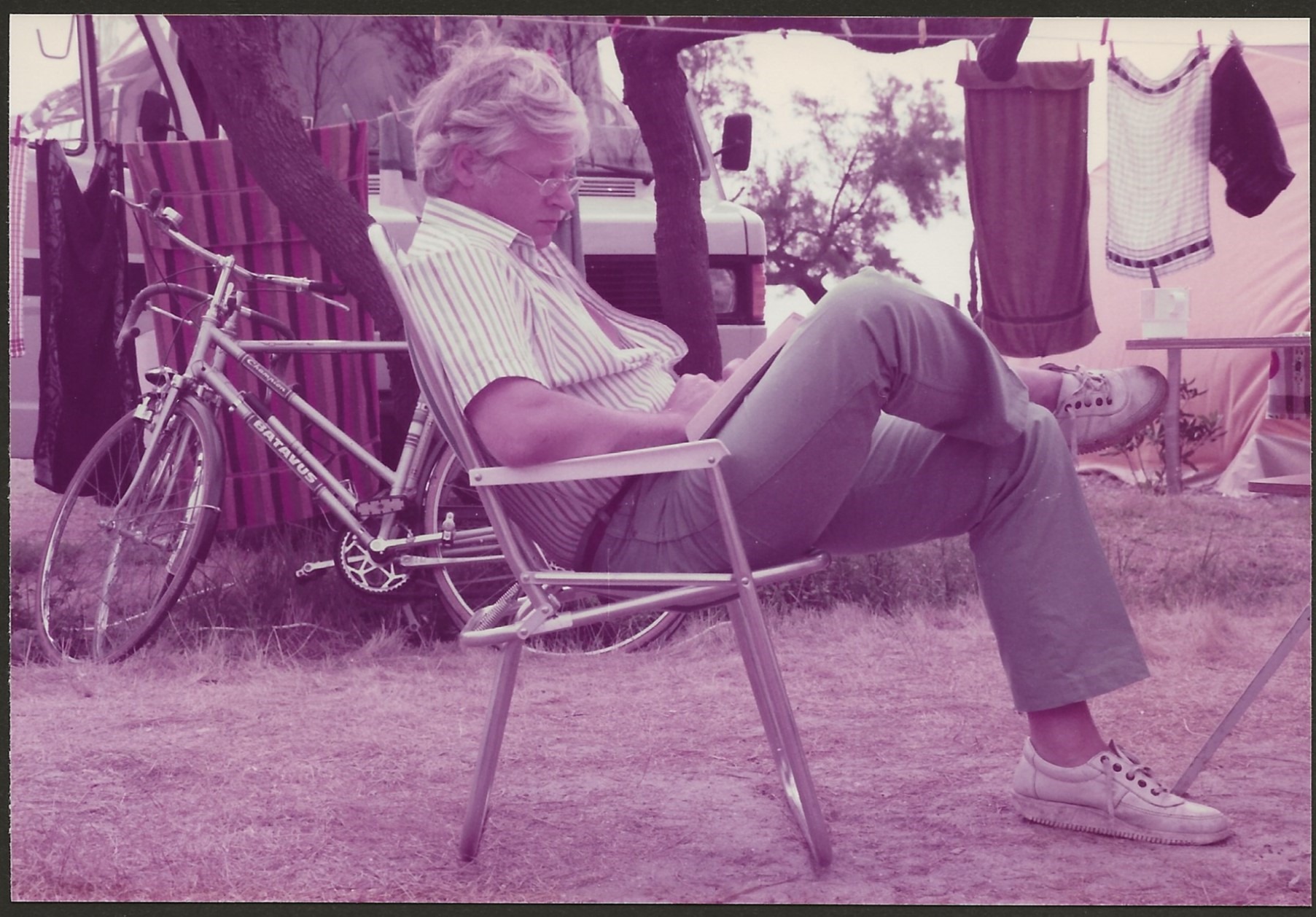 Het zijn foto's uit de jaren 80 van enkele jaren voor mijn geboorte en de fietsen en caravan passen in de tijd. Meestal staat mijn vader erop en op één foto ook mijn moeder.