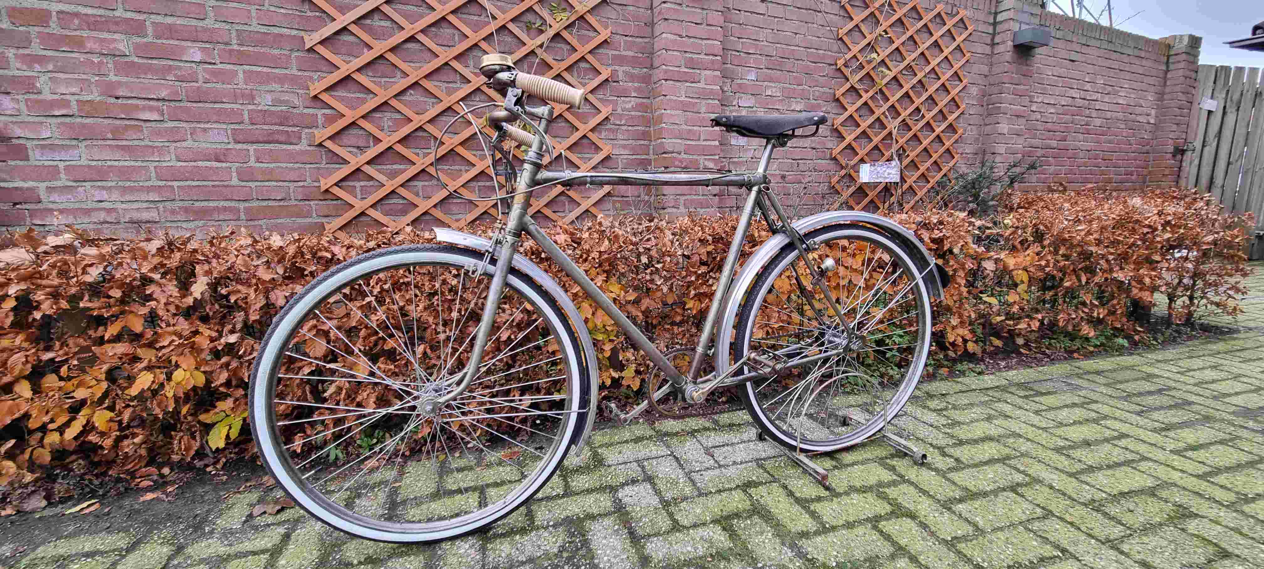 Wielen opnieuw gespaakt en een nieuwe (oude) dubbele versnellingskabel gemonteerd. Ik denk dat deze fiets van de jaren 30 is maar ik weet het zeker niet zeker.