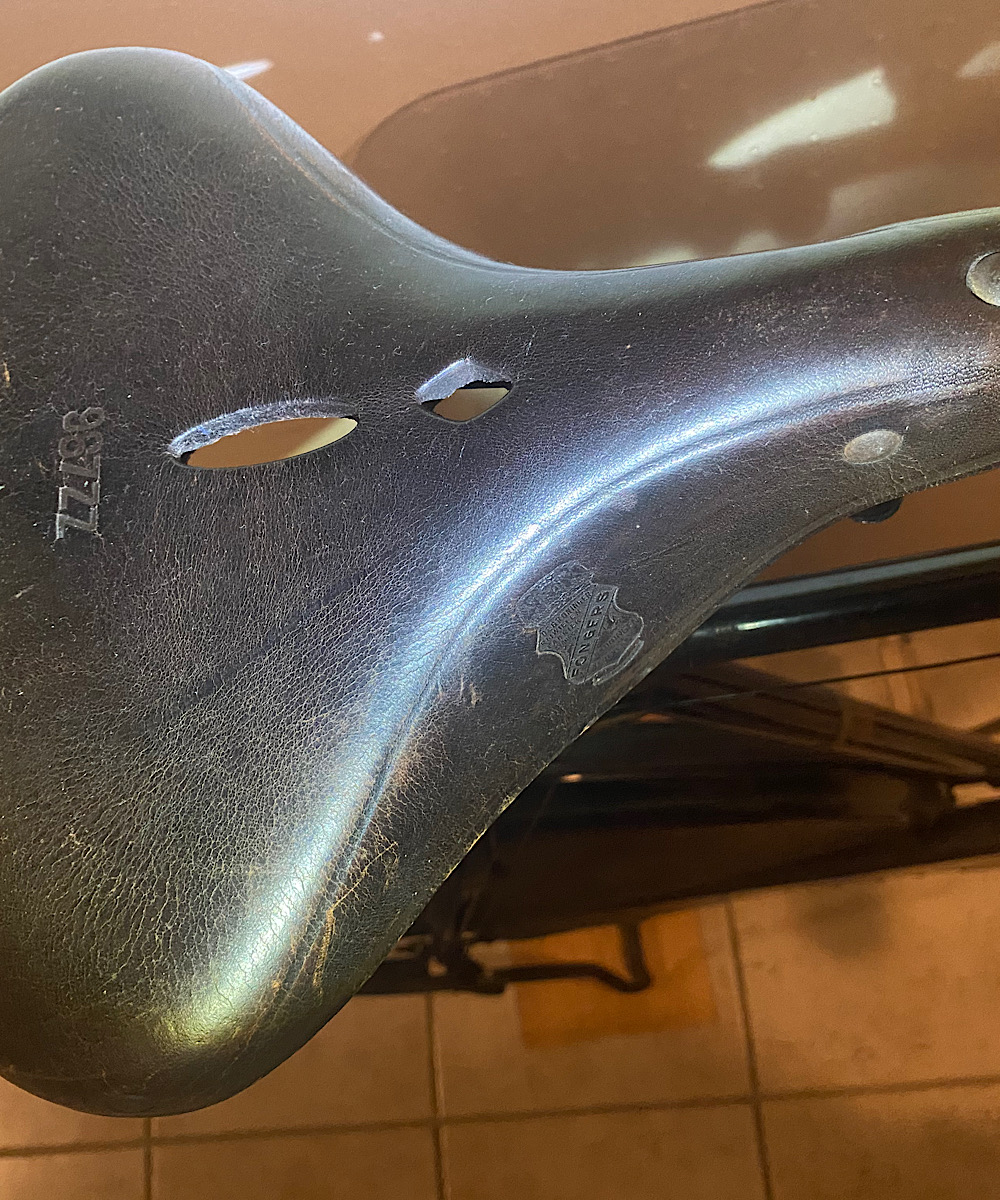 Het zadel op de hoge fiets is model 967 ZZ. Die letters staan voor 'zeer zwaar'. Dit zadel werd standaard op dienstfietsen en op transportfietsen gemonteerd; er bestaat een nog zwaarder model met dubbele veren achter.