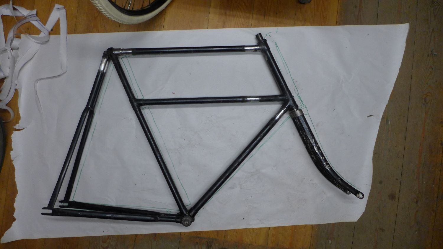Omdat ik het frame nog al lang vond (maat zadelbuis -balhoofdbuis 64cm) heb ik besloten om het frame geheel te herzien. het is nu 3 cm korter en de balhoofdhoek is iets groter geworden. Alles met zilver gesoldeerd en met binnen-buizen uitgevoerd.
