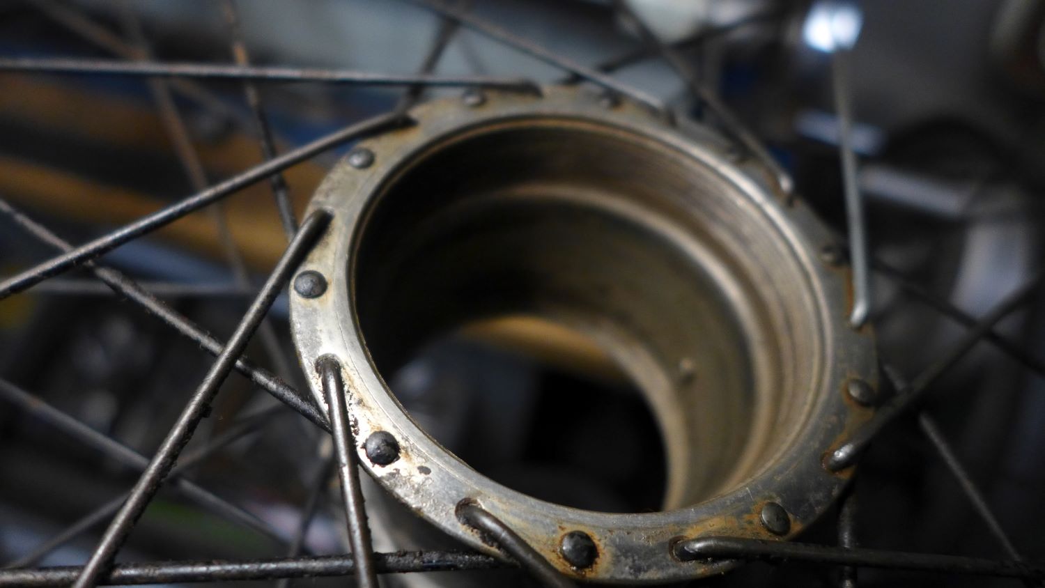 bovendien was de velg verkeerd om gespaakt en uit het midden. Bij openen van de naaf bleek het een roestige vettige smurrie te bevatten (beetje vage fotos).