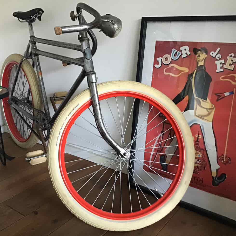 Hierin heb 650B (zo’n beetje de standaard in die tijd in Frankrijk) met Schwalbe Big ben 584 - 50 banden gemonteerd met een Nexus 8speed met rollerbrake (dat is hier vloeken in de kerk) de velgen zijn verchroomd stalen van italchero gekocht bij een Franse bromfiets onderdelen specialist.