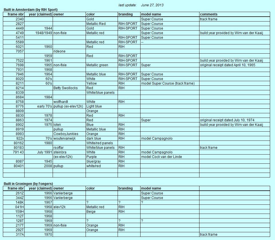 Ik heb op zolder nog een oud frame van een RIH sport-of racefiets liggen. Ik heb toen wel eens een lijstje gekregen om het bouwjaar te benaderen maar ik kan mij herinneren dat er ook een lijst is met handgeschreven de framenummers, de soort van fiets en soms zelfs de naam van de eerste koper. Zegt iemand dit iets? Ben gewoon benieuwd wat ik nu precies voor frame heb en welk bouwjaar. Het framenummer is 7277. Alvast bedankt.