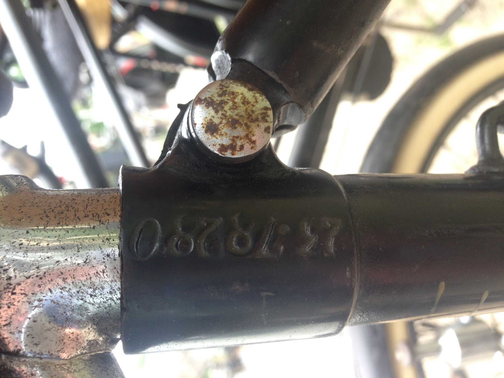 Gevonden. 22 dus ik ervan uit dat hij minimaal uit 1922 /1923 komt. Het voorwiel kan natuurlijk ooit vervangen zijn.