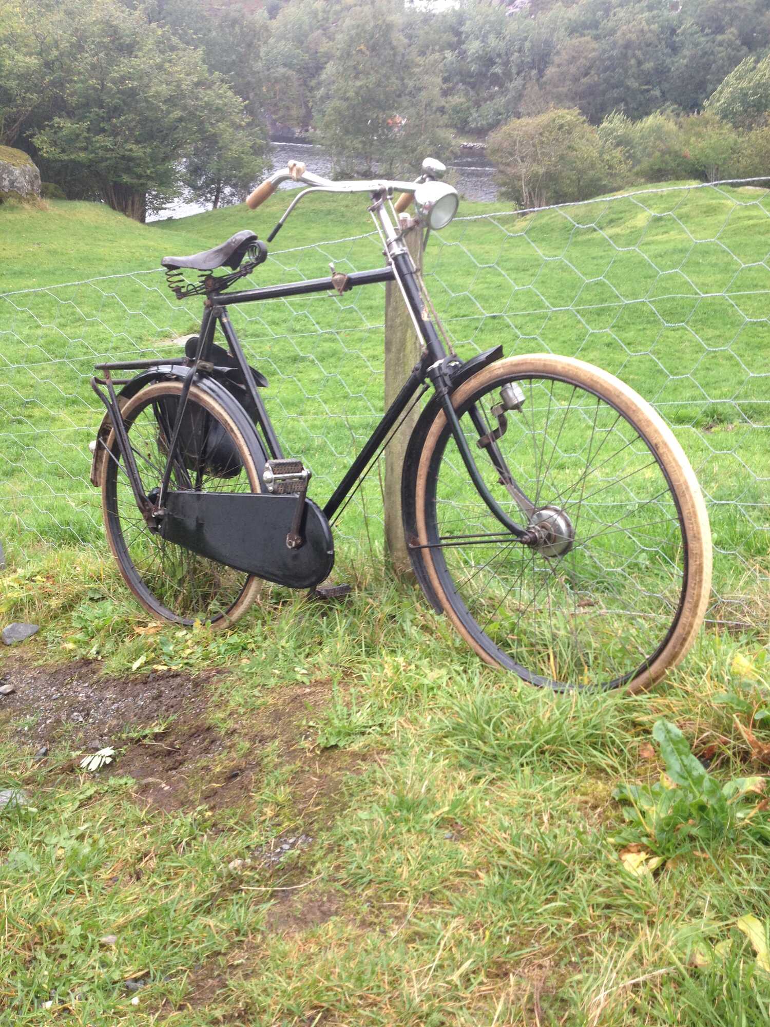 De fiets is al weer geruime tijd in deze staat.Ik vind hem zelf heel lekker rijden, al gebruik ik hem sinds ik afgelopen zomer naar Noorwegen ben verhuisd niet zo veel meer ,al kan ik hier de drieversnelllingsnaaf en trommelremmen wel echt waarderen. De fiets nu is, niet geheel origineel, maar de meeste vervangen onderdelen horen toch ook al ruim 60 jaar bij de fiets...De lucifer koplamp,de vork(van een HZ, ik weet t, en ik weet ook niet precies welk model kroonkapje erop had gemoeten ) en het Lepper zadeL heb ik zelf toegevoegd ,omdat de gebarsten naooorlogse VT lamp niet meer te redden was en de imitatie voorvork niet mooi paste en ik het niet originele zadel wat bij de fiets zat gewoon niet lekker vond zitten .Zelfs de gulden spoor en doeto buitenbanden zitten er nog op, en ik heb er ook wel over gedacht die te vervangen, vooral toen ik een tijdje ruim 50 km per week op deze fiets reed en t jammer vond om ze op te rijden ,maar bij het sporadische gebruik wat ik nu van de fiets maak, vind ik ze ook wel mooi staan.Al met al ben ik zeer tevreden met hoe de fiets er nu bij staat, al was t leuk geweest als er niet iemand het stuur met een hamer te lijf is gegaan, en ben ik blij dat er niet iemand anders dat stuur heeft vervangen door een glimmend nieuw met verkeerde bochten...groet, Rein