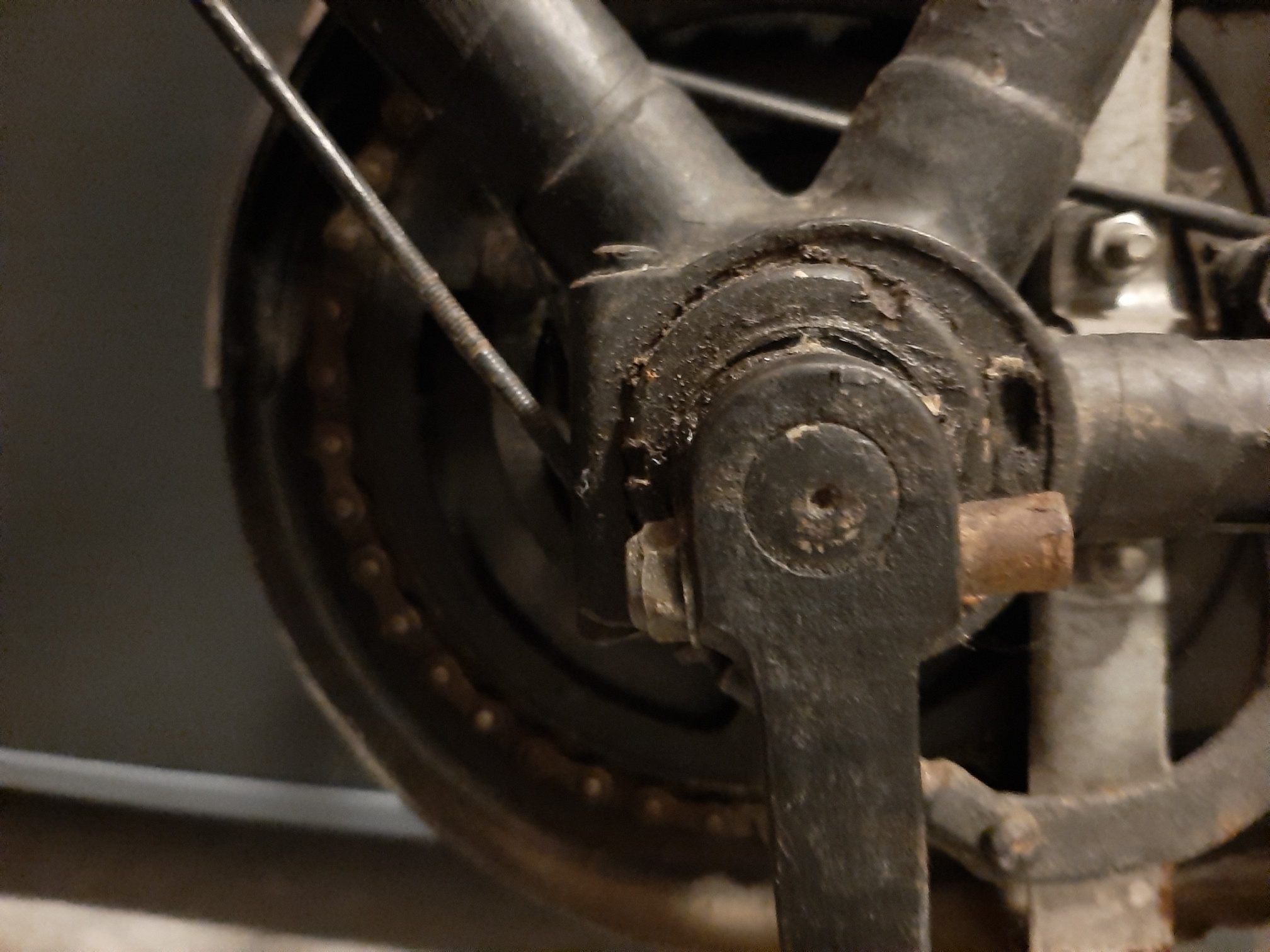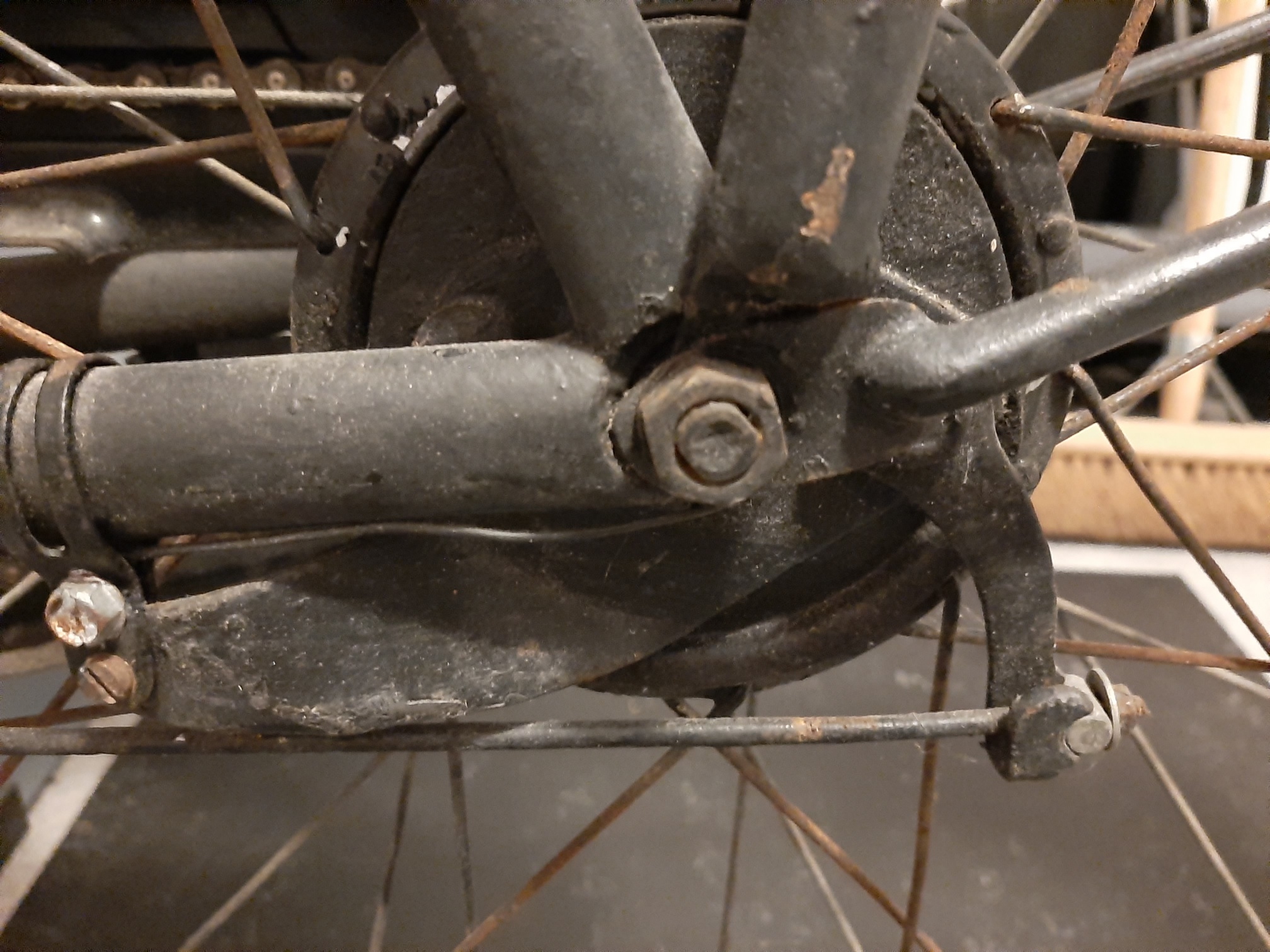 Zelden een fiets aangetroffen die zo slecht opnieuw is opgebouwd, alles rammelt letterlijk en figuurlijk. Maar we gaan deze dame zo snel mogelijk ontdoen van alles wat er niet op hoort (ik wou zeggen aftuigen...). Mogelijk zit onder de matte spuitlaag ook nog de originele lak.