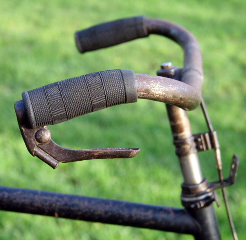 Bij de fietsen uit die tijd met een omgekeerde remgreep zit aan de rem kant de kabel vast aan het stangetje van het remsysteem.