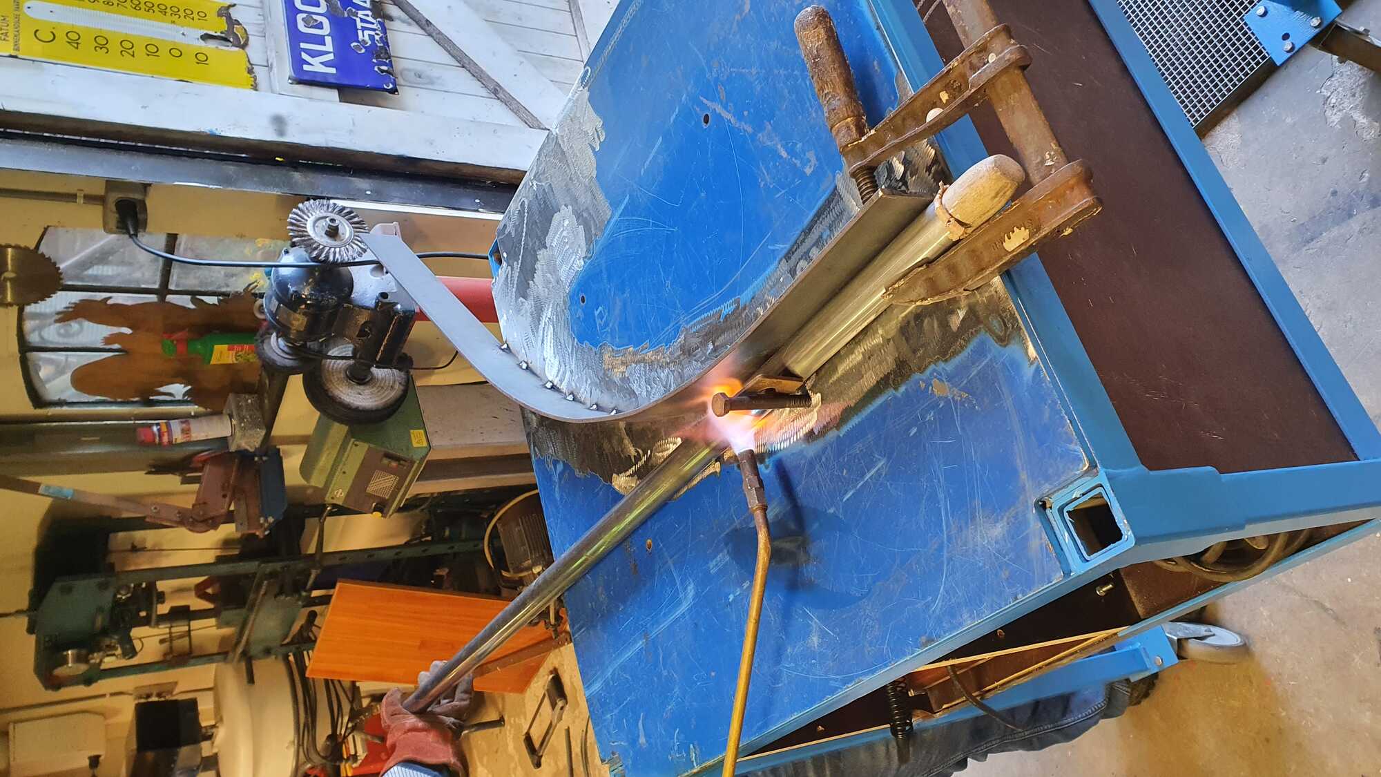 Helaas gaf dit geen succes, in de verbinding van de pijpdelen bleef een vervelende knik zitten. Hierom is besloten om een nieuw stuk pijp te buigen en tussen de backbone te lassen.