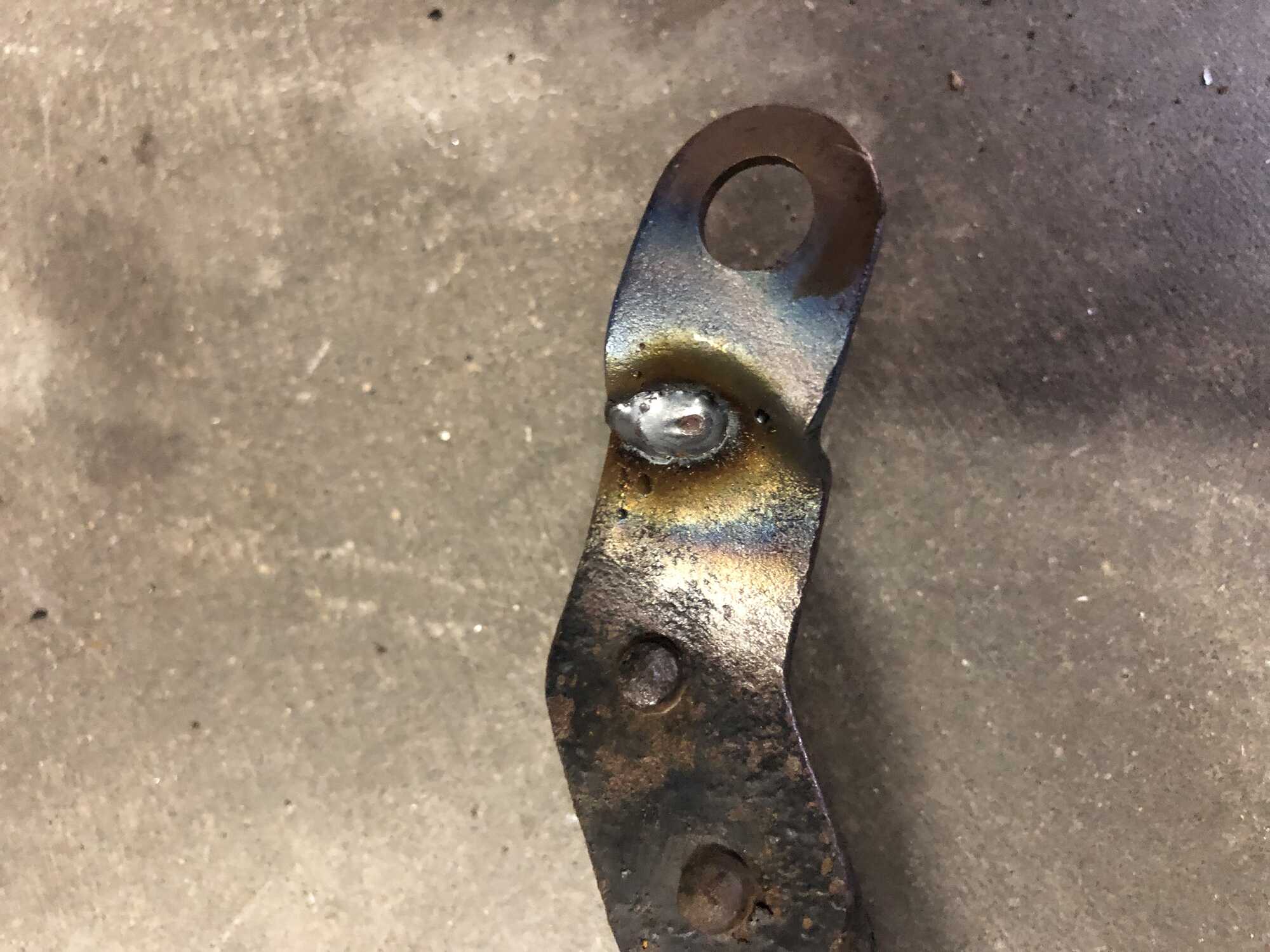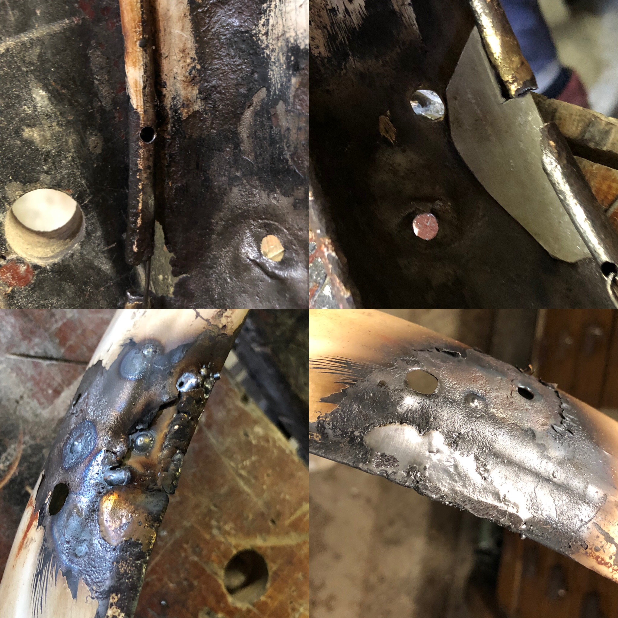 Omdat hij vanaf het gaatje waar de verlichtingsdraad doorheen komt is gaan roesten heb ik die een paar cm verplaatst. Het gat zat aan de rand dus alleen koperlatoen en tin leek me niet sterk genoeg. Helemaal doorlassen is vanwege het dunne materiaal ook geen optie dus er is een plaatje achter gemaakt die met een paar puntjes is vast gezet. Daarna alles vol laten vloeien met tin en geveild.