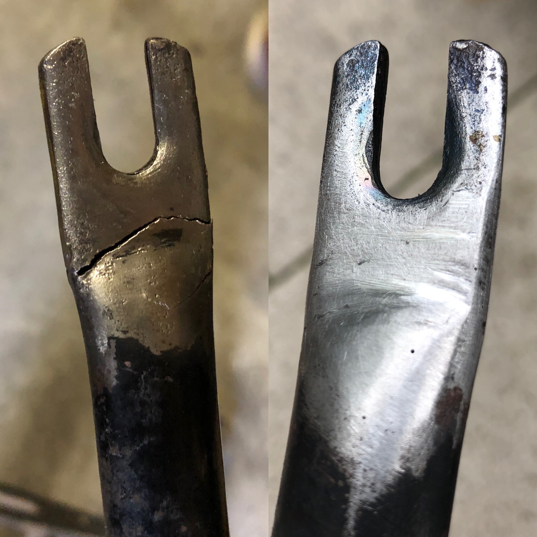 Het frame was zoals jullie weten krom. Dat is waarschijnlijk bij een ongeluk gebeurt of zoiets. In ieder geval heeft de voorvork het daarbij ook niet makkelijk gehad. Ondanks dat er met deze scheuren is door gereden leek mij dat niet echt een goed plan dus de boel maar even gelast en weer in model geveild. Die kan er weer minstens 50 jaar tegenaan!