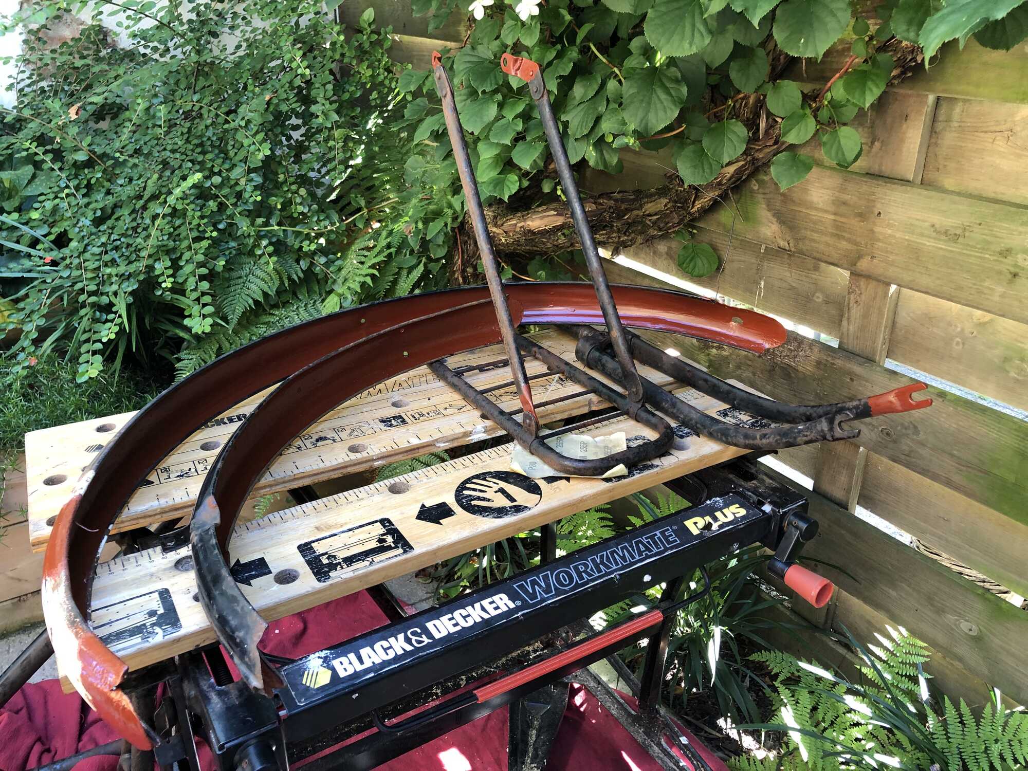 Na al het metaalwerk nu alles in de lak. Eerst alles behandelt met Brunox, een roestomvormer. En na twee lagen hiervan zitten er nu twee lagen ijzermenie overheen. Zoals gezegd een praktische restauratie dus de binnenkant van de spatborden is weer goed beschermd. Overige reparaties lat ik zichtbaar (ook niet echt een andere optie) door ze in de goede kleur te lakken en meer niet.
