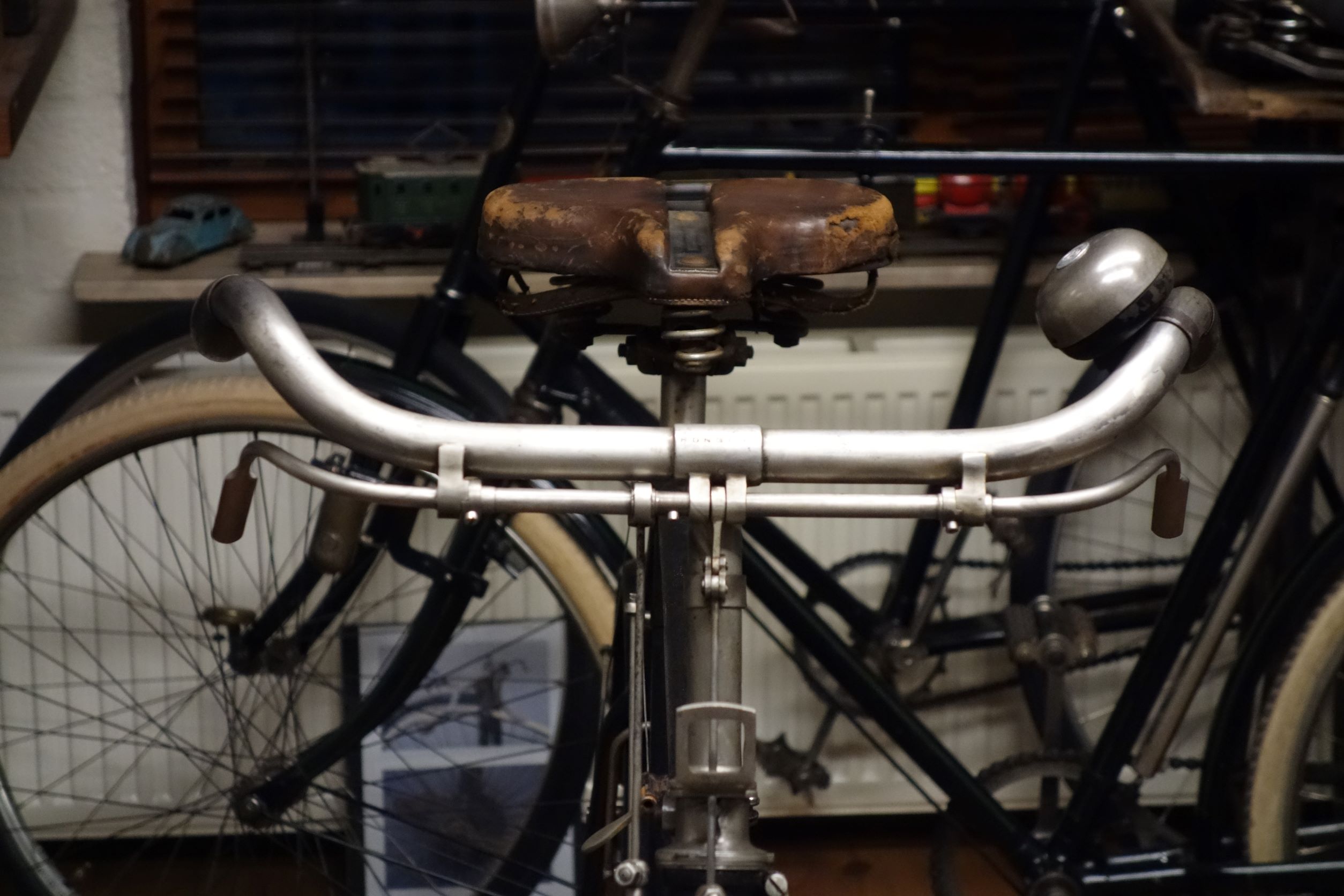 De latere fietsen hebben al de ronde stang met celluloid hoesje.