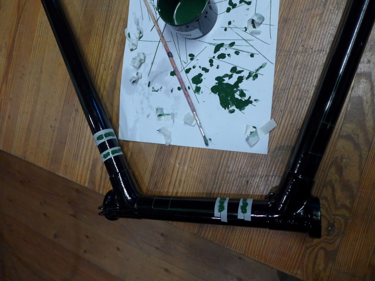 In feite ben ik weer met een kaal frame begonnen. De groene lak beviel me toch niet zo goed en de zwarte Hammerite spuitlak die ik daar over heen had gezet was niet van een thinner oplosbare soort en wat te vaal van kleur.