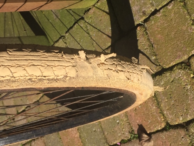 Ik ben net een stukse met de fiets gaan fietsen en kwam er tot mijn spijt achter dat het canvas van de achterband weliswaar nog sterk is maar het rubberen profiel dus niet meer! :oops: