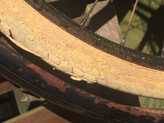 De achterband was volledig vergaan. De binnenbanden met kort ventiel zijn Vredestein Potdicht maar helaas is een van de twee zijn ventiel verloren. Het kwam gewoon los van de band dus die heb ik opgegeven.