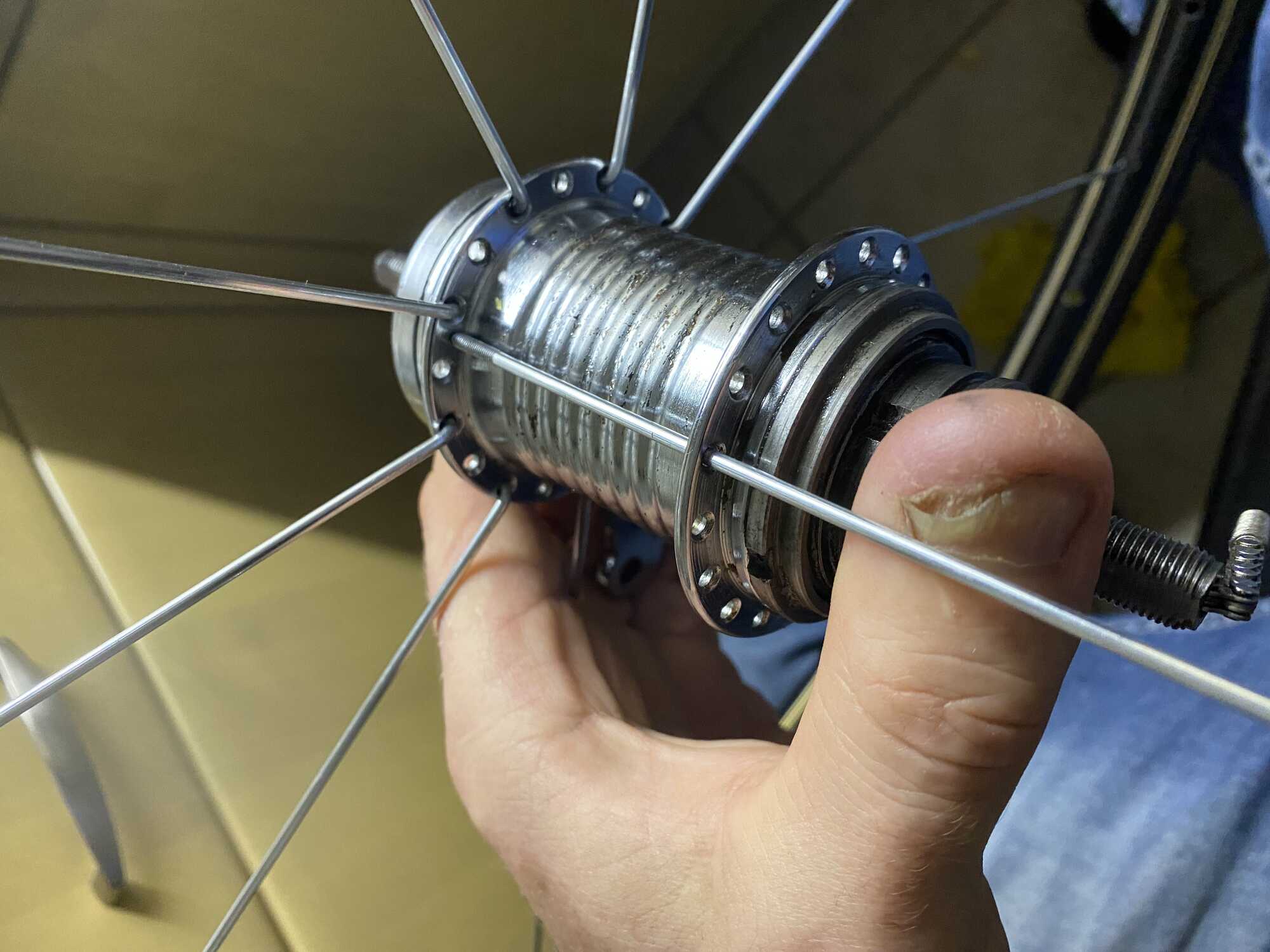 Na een mislukking nu toch het achterwiel weten te spaken. Eerste keer geen rekening gehouden met vroege en late gaten en dan lukt het niet, je komt dan niet uit met de spaaklengte. Toen ik daar achter was dat het probleem daarin zat kon ik via de site van m-gineering zo vinden hoe te spaken, hij zit erin die Torpedo.