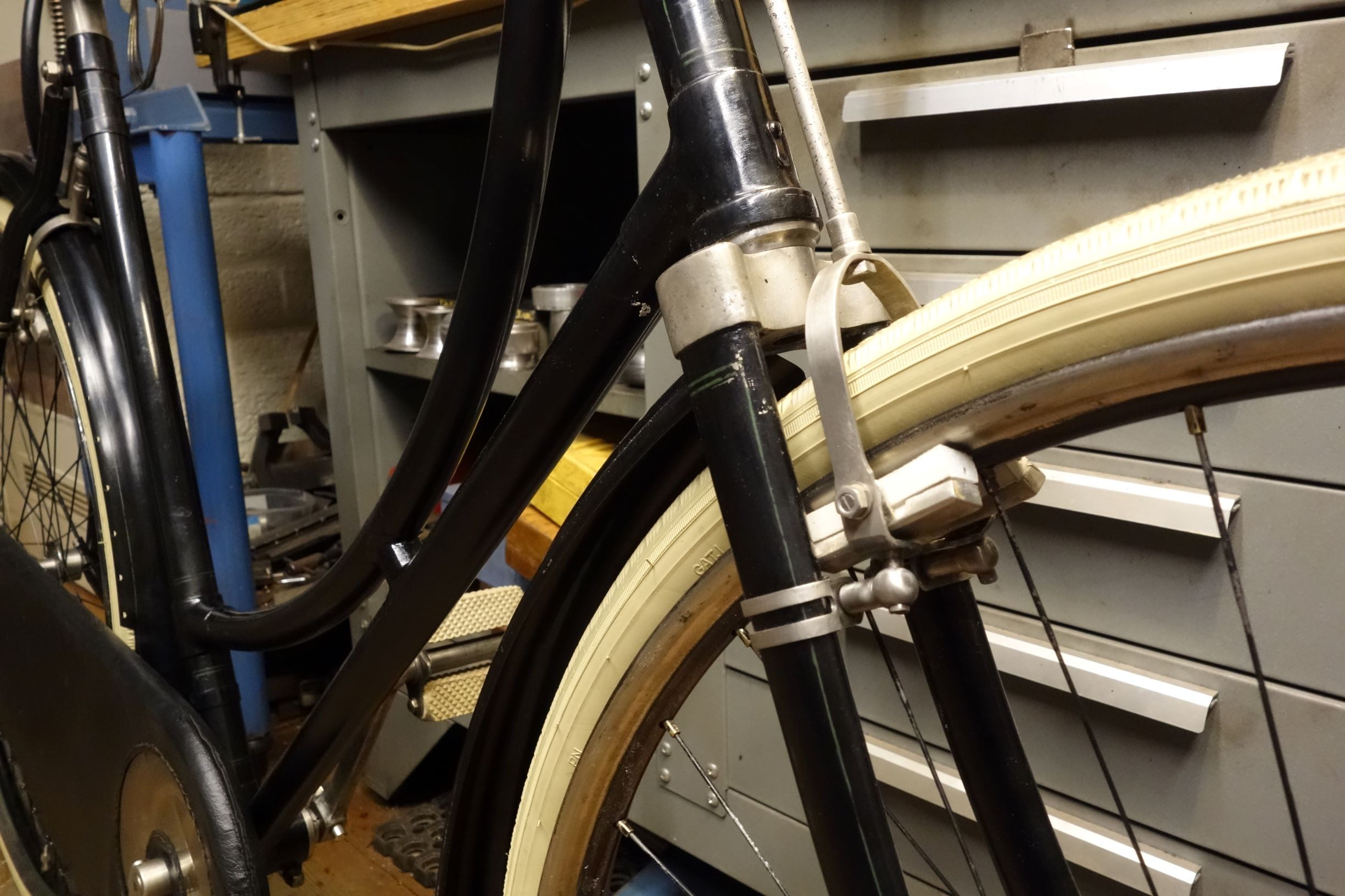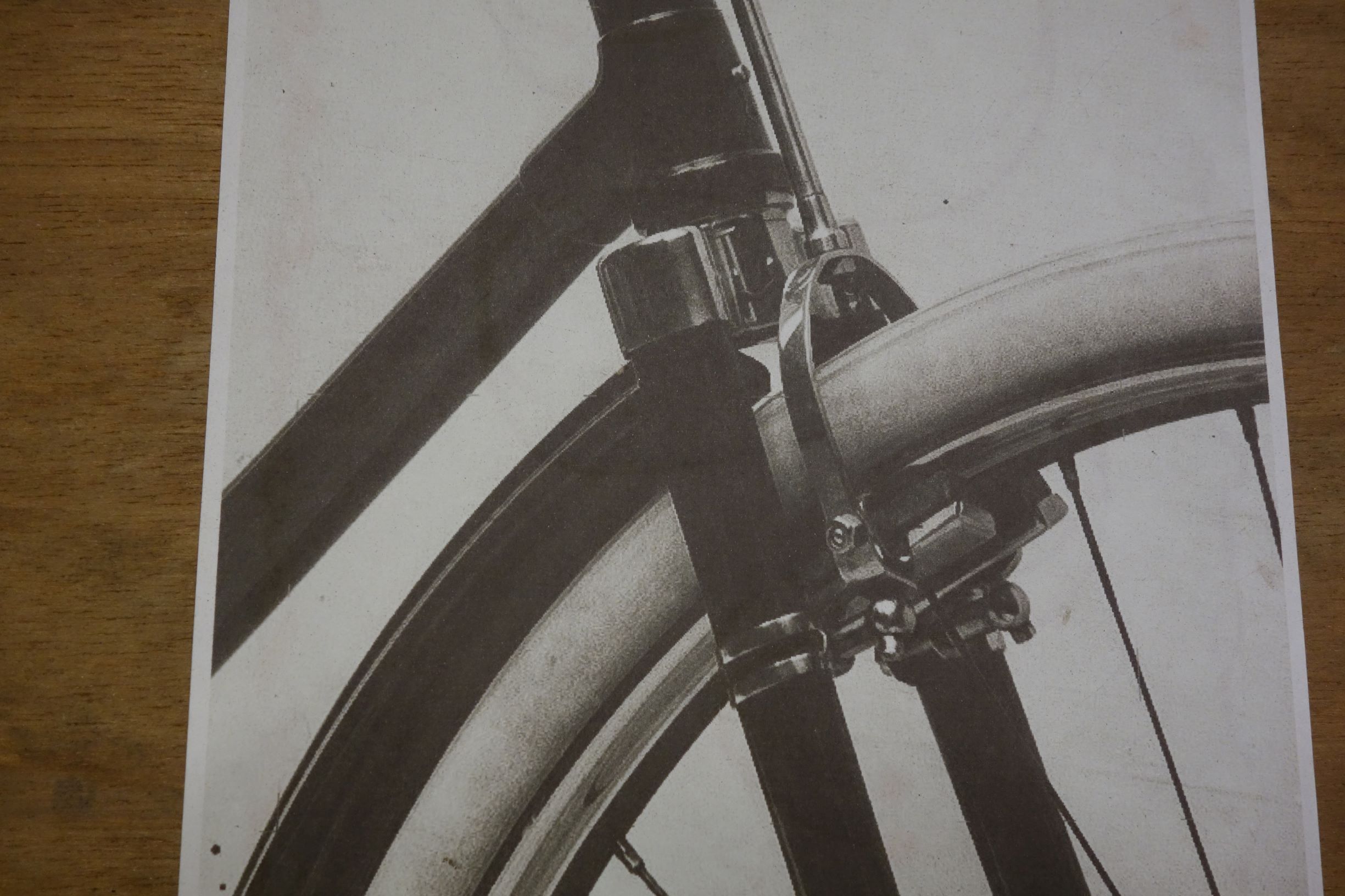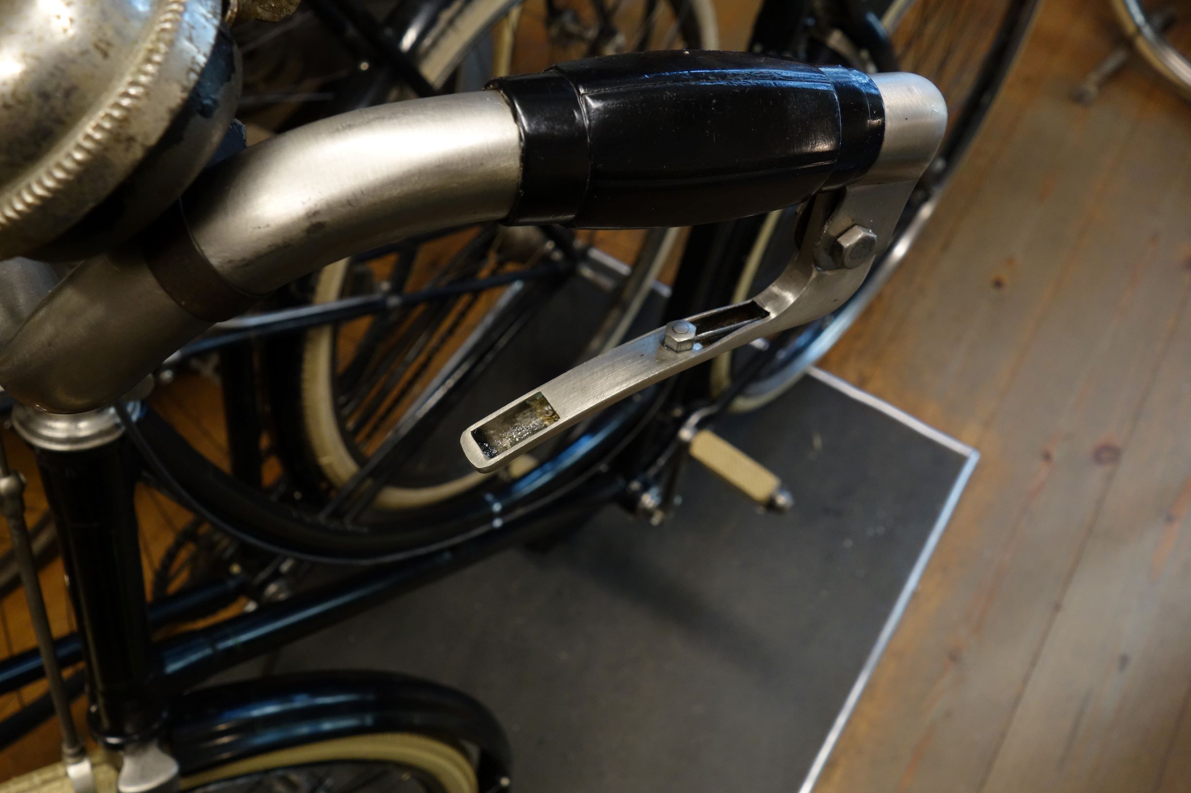 De remconstructie lijkt me wel kwetsbaar/moeilijk afstelbaar, zeker met die (nog te monteren) kabels door het stuur heen. Er zijn nauwelijks Fongers fietsen van voor 1925 met kabelbediende remmen overgebleven. De BBK 1909 van Velorama komt een beetje in de buurt; de Bowden remmen hierop waren tot 1930 tegen fikse meerprijs leverbaar.