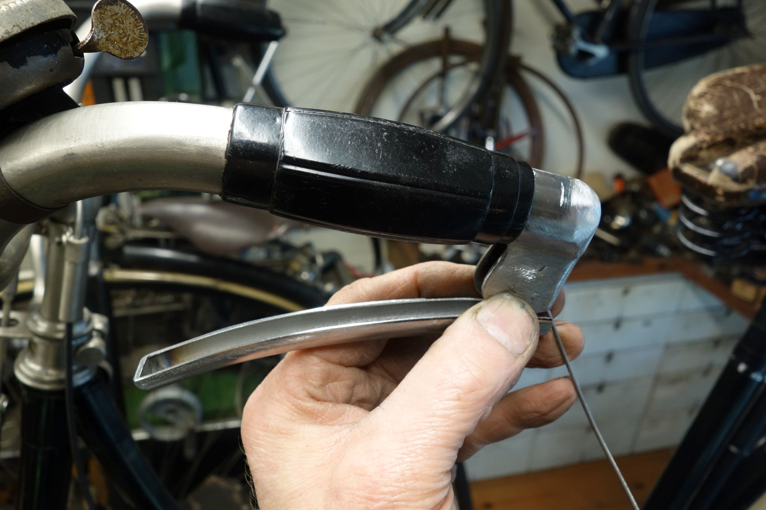 Leuk die foto van de Bowdenrem van die 1909 BB. Je ziet de veer zitten die ook in het Fongers systeem zit om de hoefijzer terug te dwingen en de kabel op spanning te houden. Eigenlijk is het het zelfde systeem waarbij ik de Fongers versie toch wat solider vind.