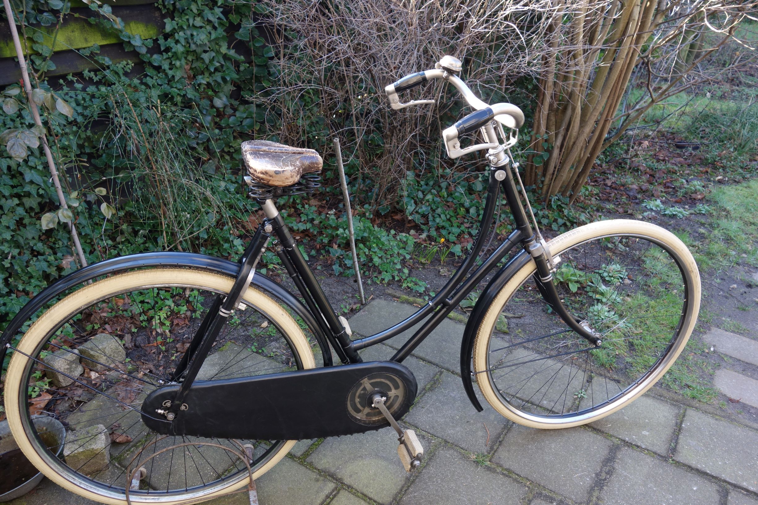 Overigens is de remkabel naar achter vrij losjes aan de fietsen gehangen en ook een flinke bezuiniging op de eerdere constructie (1905- 06)met stangen. Ik krijg intussen wel het gevoel dat het een prettig oude fietsje aan het worden is al zal nog veel afhangen van de afwerking Er moet nog een Fongers zadel met 4 achterveren en een sleuf in het leer achter de neus gemaakt worden (dat hadden de CCG`s en BDG`s). en natuurlijk de jasbeschermers.