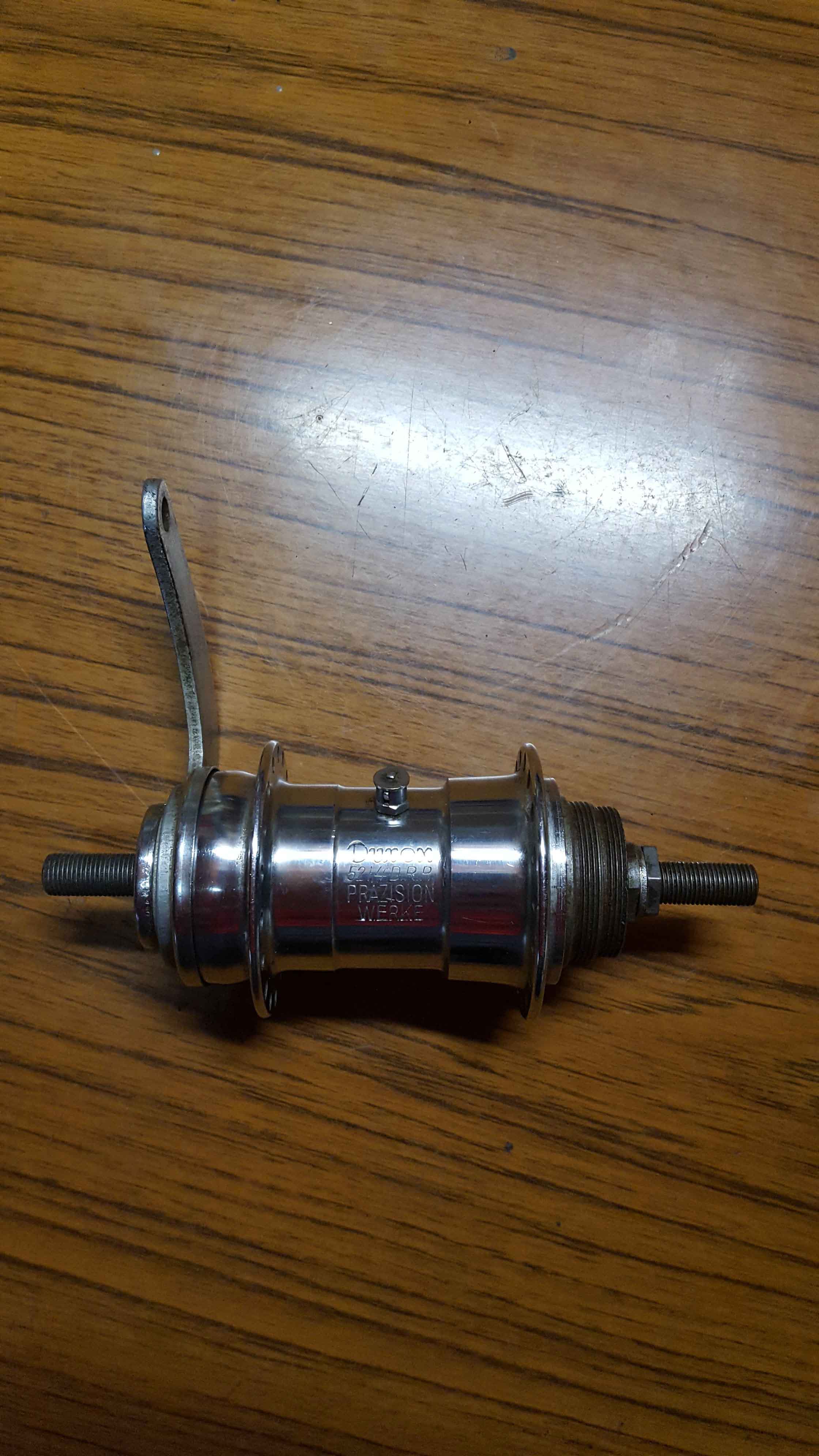 Wegens foutieve aankoop: Durex achternaaf van 1952 met terugtraprem. Heb de naaf bekeken en ziet nog perfect uit: zowel chroom als slijtdelen zien er nog heel erg goed uit. Heb het vermoeden dat deze NOS is.