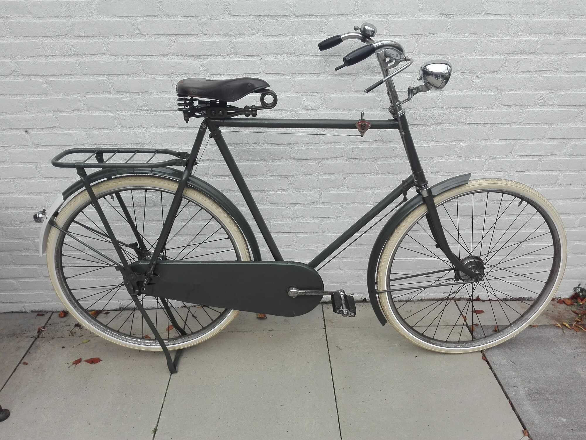 Dit weekend leuke schuurvondst gedaan: een Fongers HZ65 uit 1940 in grijs-groen. De fiets is begin 1940 aangeschaft door burgemeester Mijnlieff van de voormalige gemeente Anna Paulona; het belastingplaatje 1940-1941 zit nog op het stuur! Deze man heeft er naar verluidt weinig op gereden en zijn schoonzoon heeft de fiets in de jaren 70 naar Den Haag gehaald en een kleine 25 jaar voor dagelijks gebruik benut. De laatste ca. 20 jaar heeft de fiets in een open ruimte (buitenlucht) gestaan, waardoor hij behoorlijk is aangetast (behalve het fraaie verzwaarde zadel, dat eraf was gehaald en vervangen door een lager zittend model).